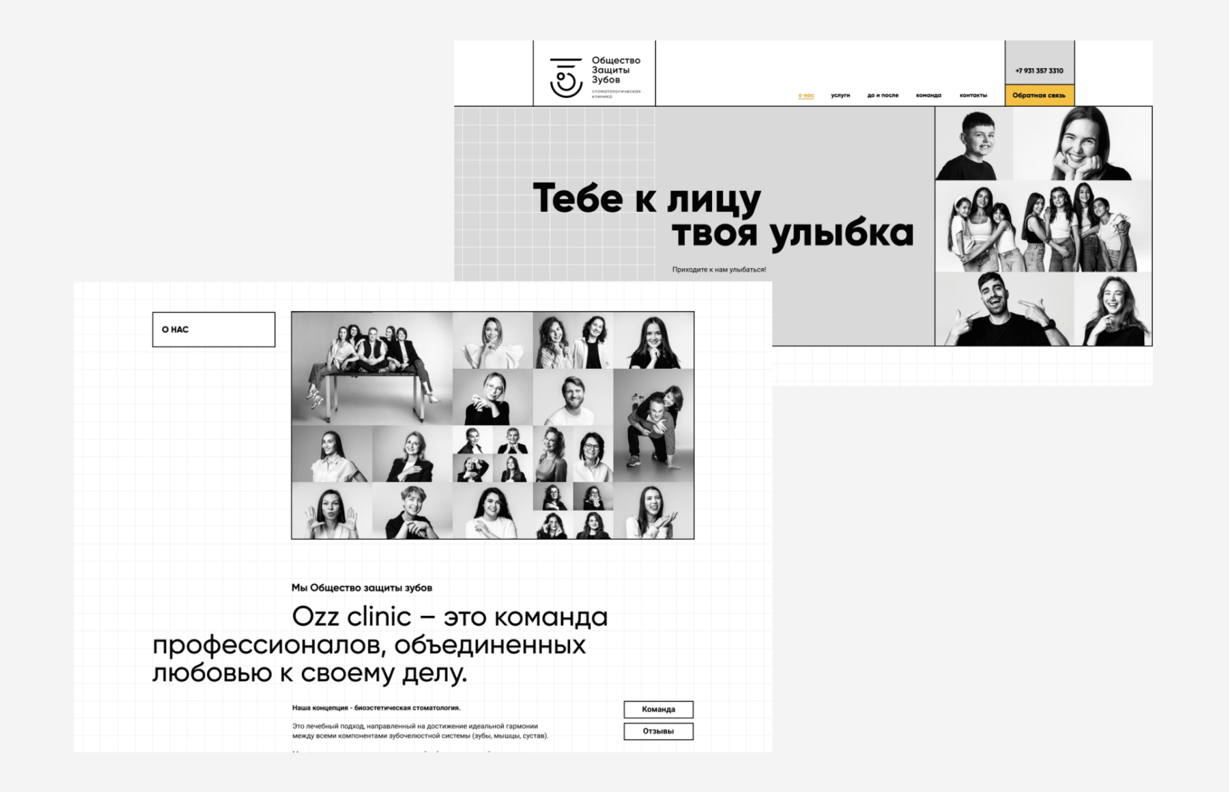 Перед нами стояла сложная задача придумать образ новой стоматологической клиники – бренда с выразительным именем и креативным «лицом». Первое, с чего мы начали, – поиск звучного и уникального наименования. Мы хотели добавить легкости и шутливости в название клиники, чтобы пациенты чувствовали себя более комфортно и менее тревожно. Отсюда появились такие варианты, как «Вайтшпиль», «Зубровник», «Зуб за Зуб», «Шпашибо, доктор». В итоге мы остановились на названии «ОЗЗ – Общество Защиты Зубов», которое понравилось как нам, так и заказчице.