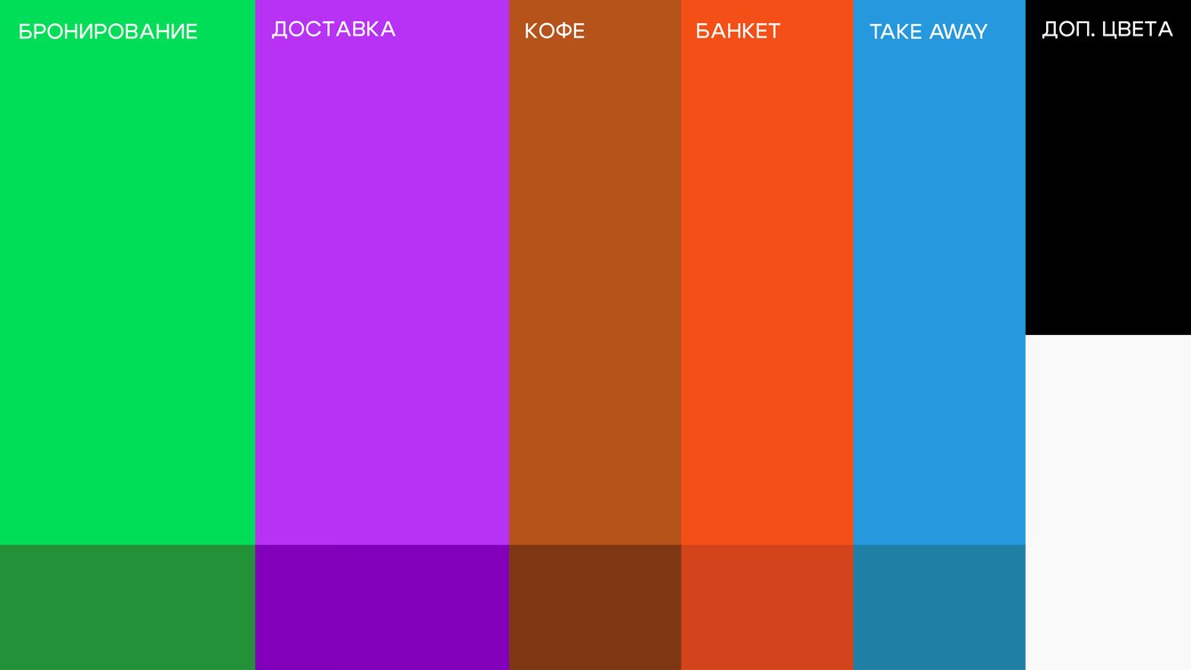 Зеленый — это бронирование, фиолетовый — доставка, коричневый — кофейни, оранжевый — банкеты, а take away — голубой.