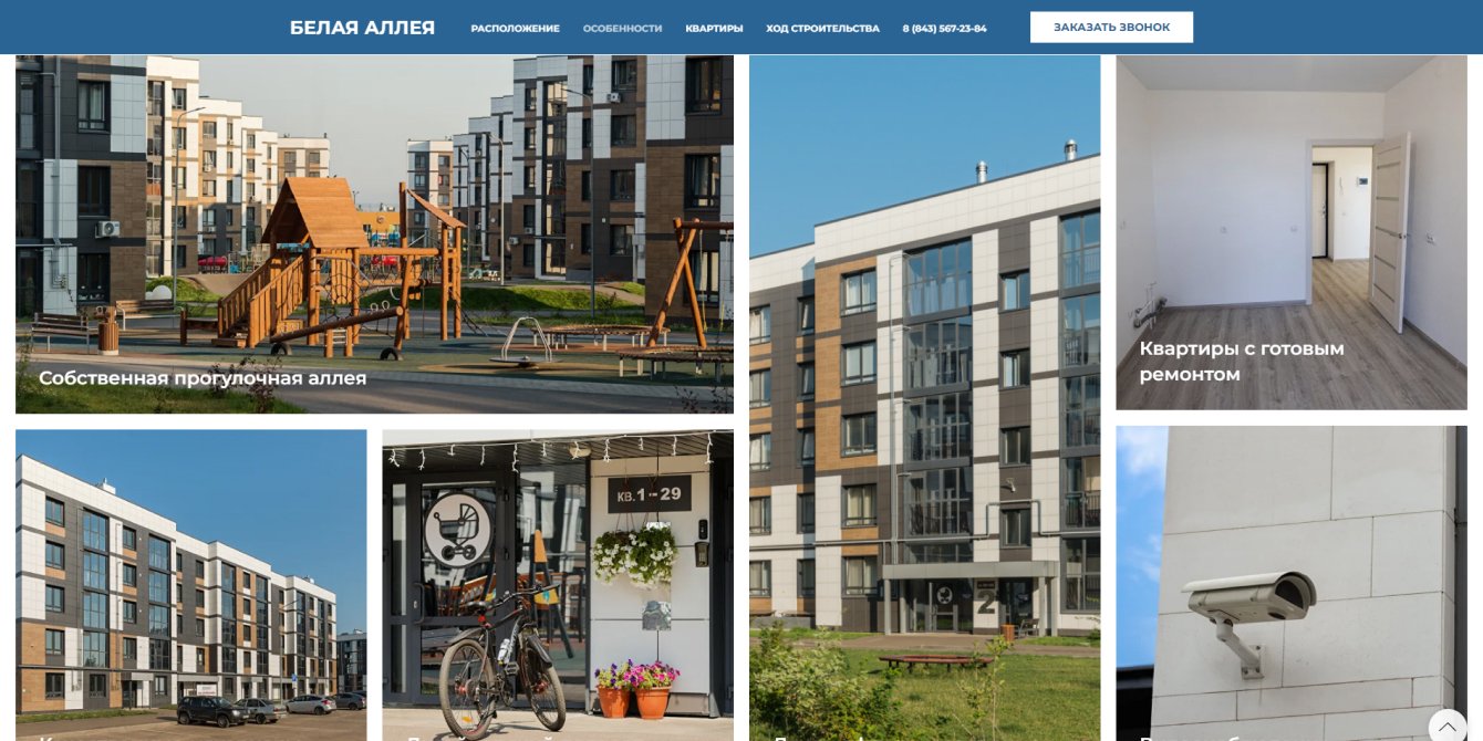 Мы разработали фирменный стиль компании — соединили темно-синий цвет со светло-бежевым — и, следуя ему, создали сайт. Динамичный главный экран привлекает внимание пользователей и отвечает на основные вопросы о жилом комплексе. На сайте также есть вся информация о «Белой аллеи»: новости, динамика строительства, ипотечная ставка и подробные планировки.