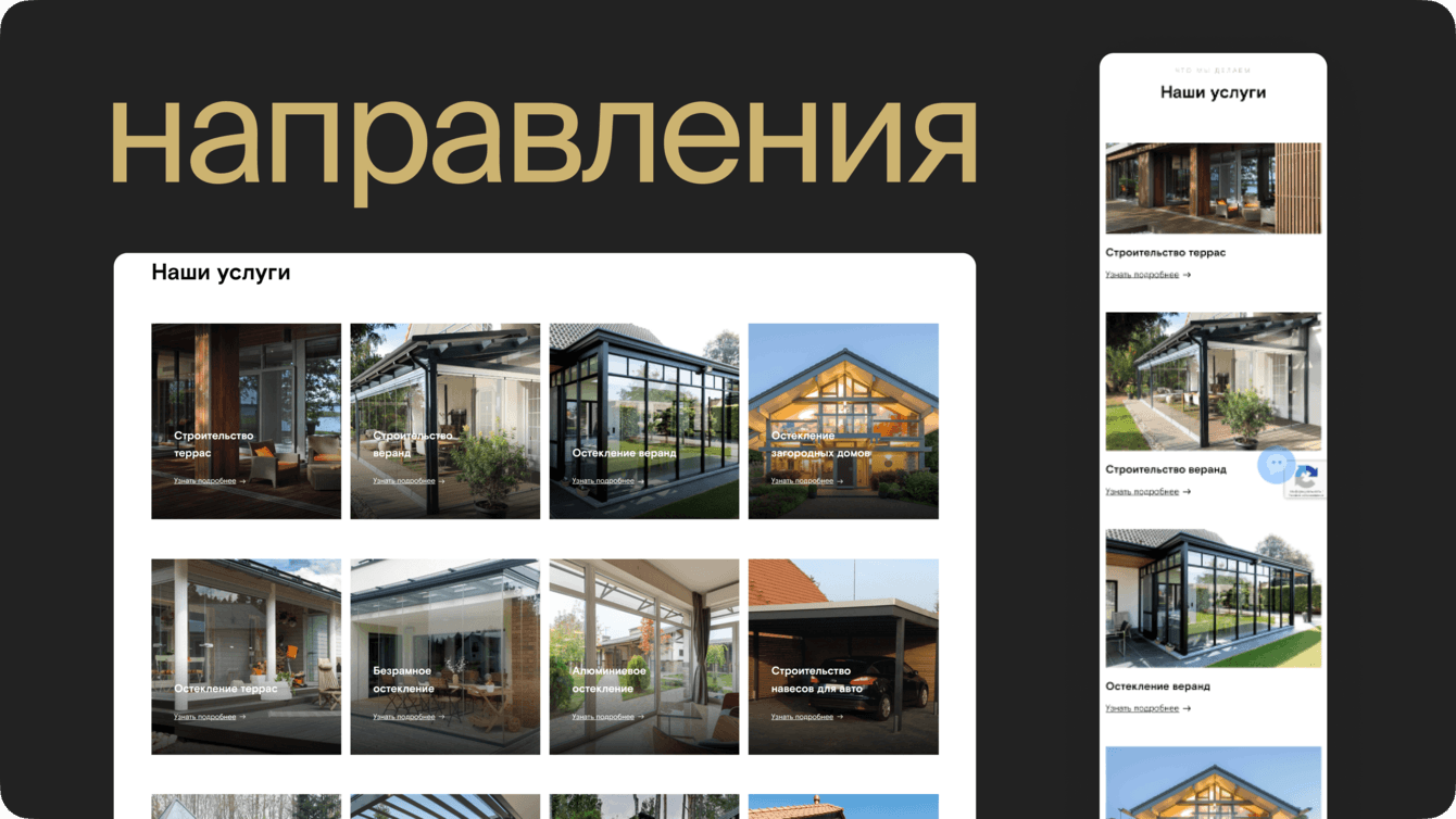 С ростом бизнесу интересны крупные клиенты, которые ценят качество и безукоризненную работу. Клиент хотел запоминающийся сайт, который подчеркнет, что компания производит качественные террасы и остекление, предлагает сервис на высоком уровне, исключая из жизни покупателя стройку на участке.