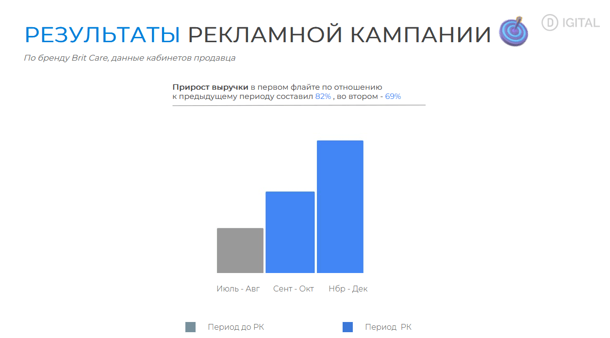 Итоги рекламной кампании Brit Care показали значительный рост по ключевым показателям. Уже на первом флайте плановый KPI по выручке был перевыполнен на 59%, что обеспечило рост продаж на 82% относительно базового периода. На втором флайте рост выручки составил 69%, при этом накопленная статистика позволила более точно прогнозировать результаты и эффективнее распределять рекламный бюджет. Третья волна кампании была сфокусирована на оптимизации расходов, и это позволило снизить долю рекламных расходов при сохранении стабильного объема продаж.