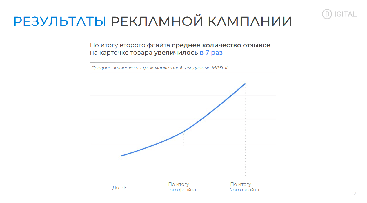 Дополнительно был достигнут KPI по количеству отзывов на карточках товаров: их число увеличилось более чем в семь раз, что позитивно отразилось на органической выдаче и доверии к бренду на маркетплейсах. Несмотря на изменения правил размещения на площадках и сезонные факторы, кампания показала стабильный результат и показала эффективность комплексного подхода, включающего использование аналитических инструментов и адаптацию стратегии под условия рынка.