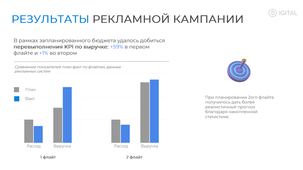 Итоги рекламной кампании Brit Care показали значительный рост по ключевым показателям. Уже на первом флайте плановый KPI по выручке был перевыполнен на 59%, что обеспечило рост продаж на 82% относительно базового периода. На втором флайте рост выручки составил 69%, при этом накопленная статистика позволила более точно прогнозировать результаты и эффективнее распределять рекламный бюджет. Третья волна кампании была сфокусирована на оптимизации расходов, и это позволило снизить долю рекламных расходов при сохранении стабильного объема продаж.