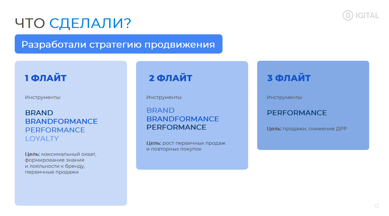 Кампании запускались флайтами по два месяца. Первый был направлен на максимальный охват и узнаваемость бренда, второй на рост продаж и повторных покупок, третий на усиление продаж и снижение затрат. Продвижение шло одновременно на нескольких площадках, включая работу с акциями и карточками товаров.
