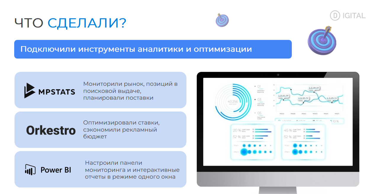 Были подключены системы аналитики (MPStats, Orkestro, Power BI), что позволило мониторить позиции и продажи, оптимизировать ставки и контролировать эффективность кампании в режиме одного окна. Так же был проведен запуск рекламных размещений и баннеров на маркетплейсах, подготовлены креативы для бренда.