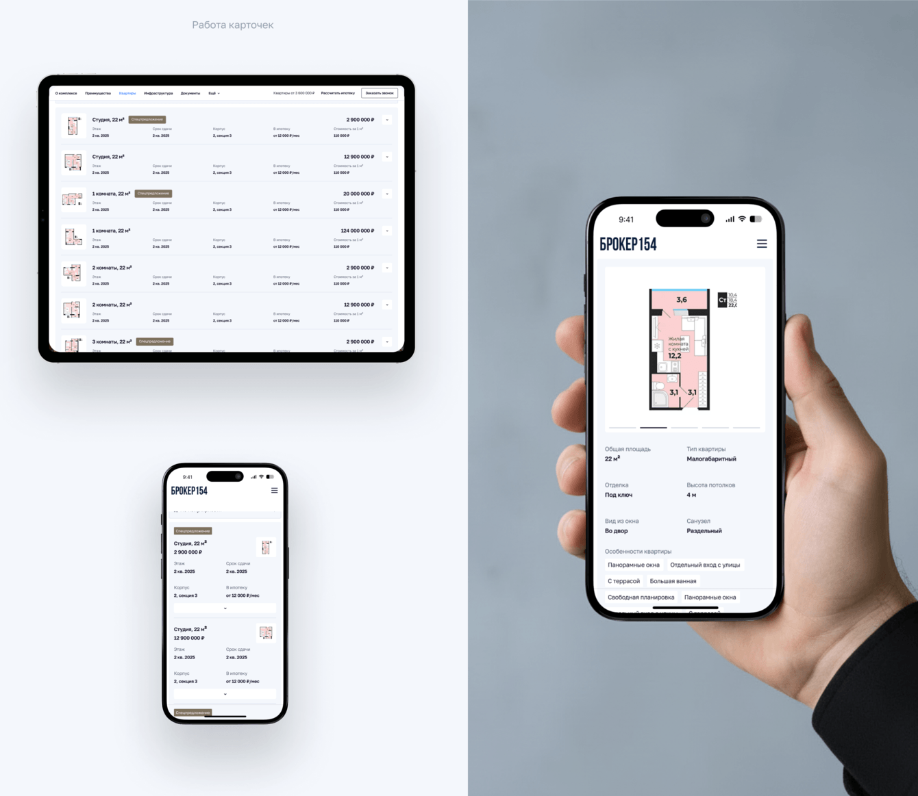 В итоге у клиента появился работающий продуктовый сайт, где ключевая ценность сосредоточена в каталожной механике. На практике это означает, что сайт был собран вокруг сценария выбора объекта: пользователь не просто читает страницы, а взаимодействует с каталогом и параметрами подбора. Технически результат выражается в том, что каталог не был вручную наполненным справочником. Данные по объектам подтягивались из внешнего источника/CRM: сайт должен был получать, обрабатывать и отображать массив объектов и их параметров, а также учитывать динамику статусов. Это важная характеристика зрелого каталожного решения: оно рассчитано на изменения в данных и эксплуатацию в режиме «живого продукта», а не на статичную публикацию.