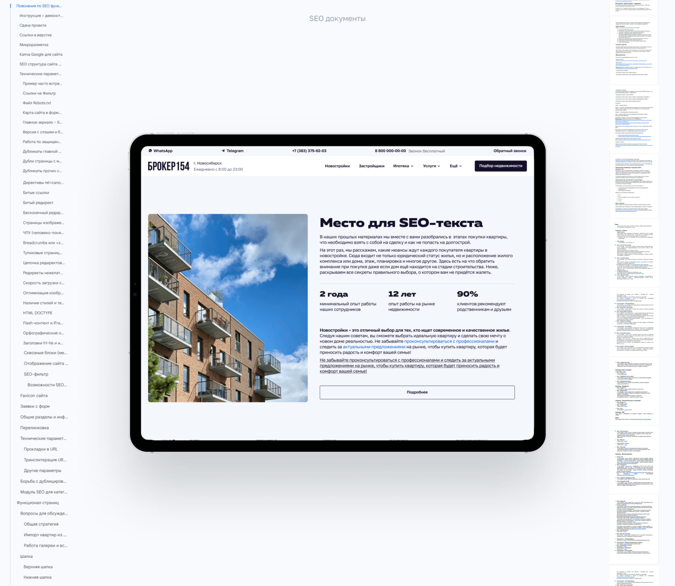 У клиента уже был сайт, но он не соответствовал новой задаче бизнеса – нужно было не просто присутствие в интернете, а платформа для системной работы с органическим трафиком в нише новостроек Новосибирска.