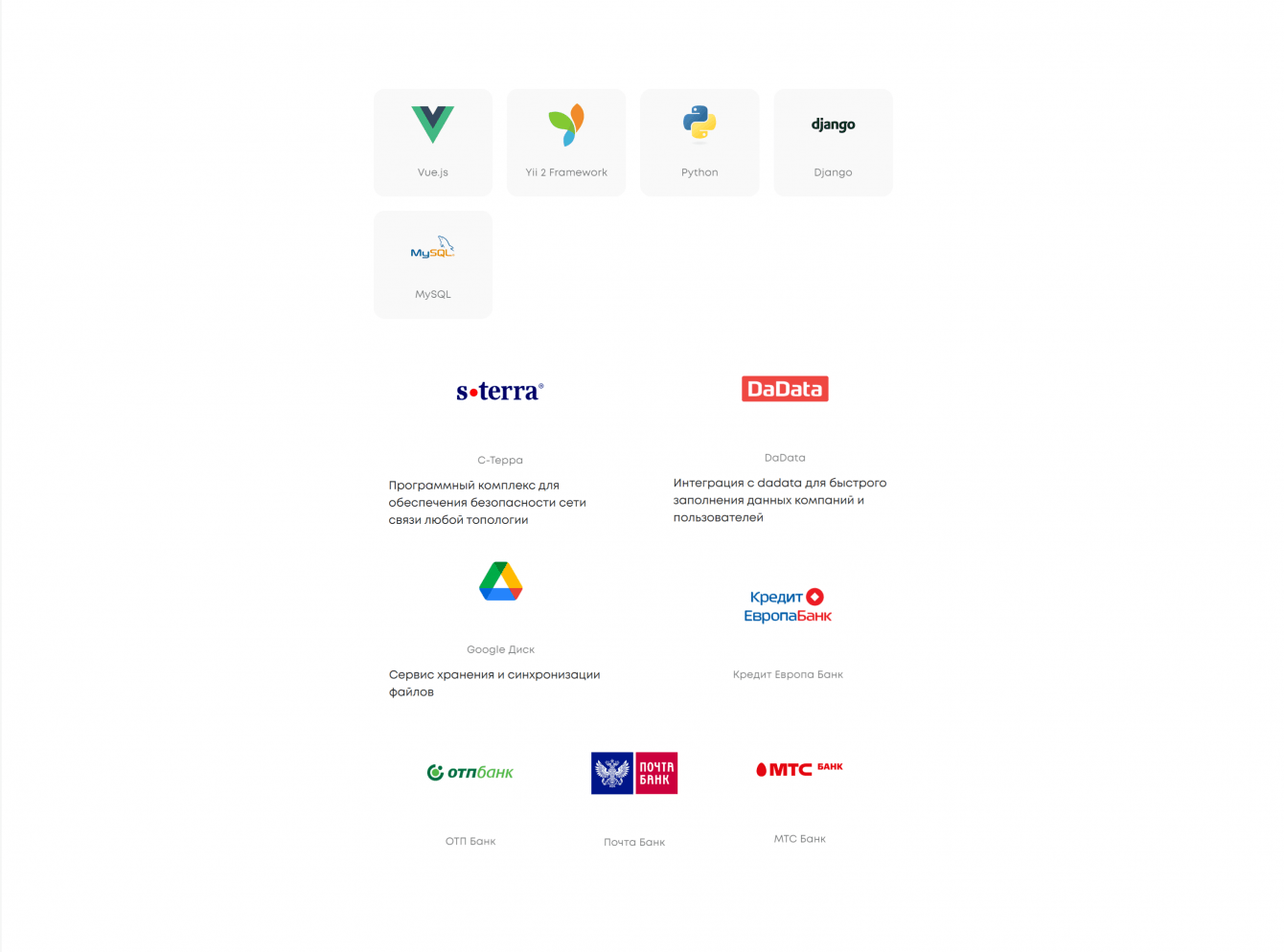 - Успешная интеграция с такими банками, Почта Банк, Альфа Банк, МТС Банк, ОТП Банк