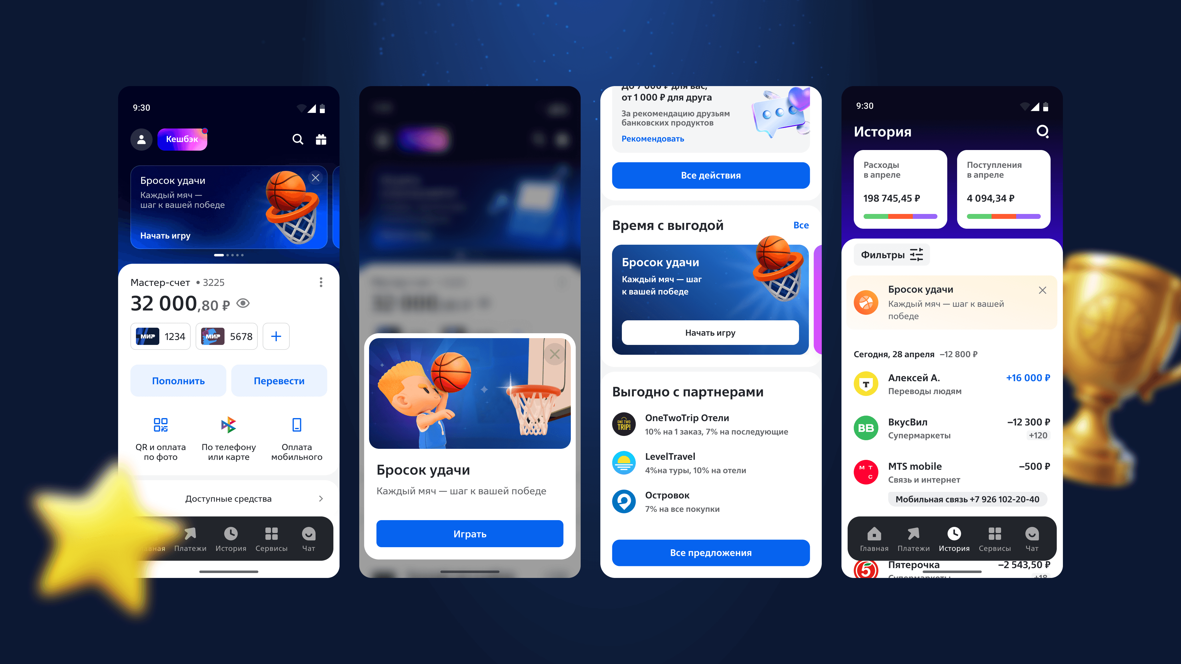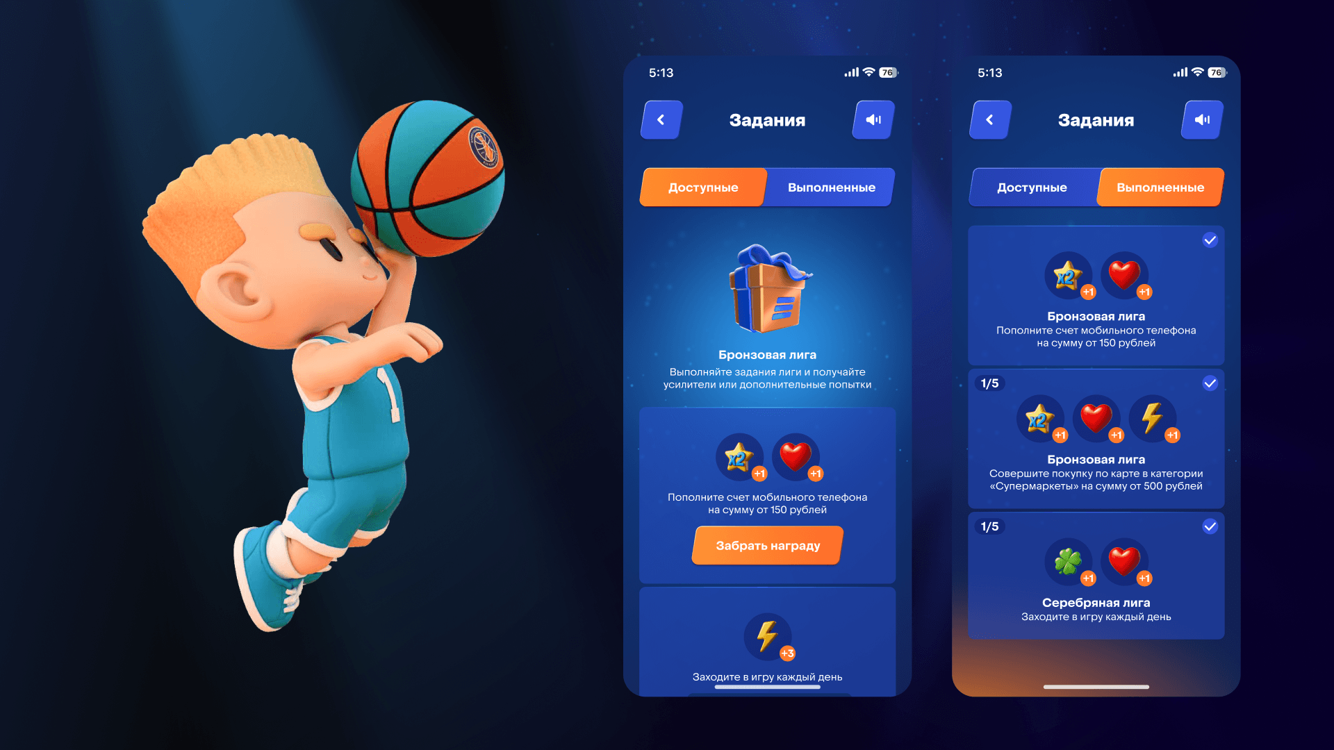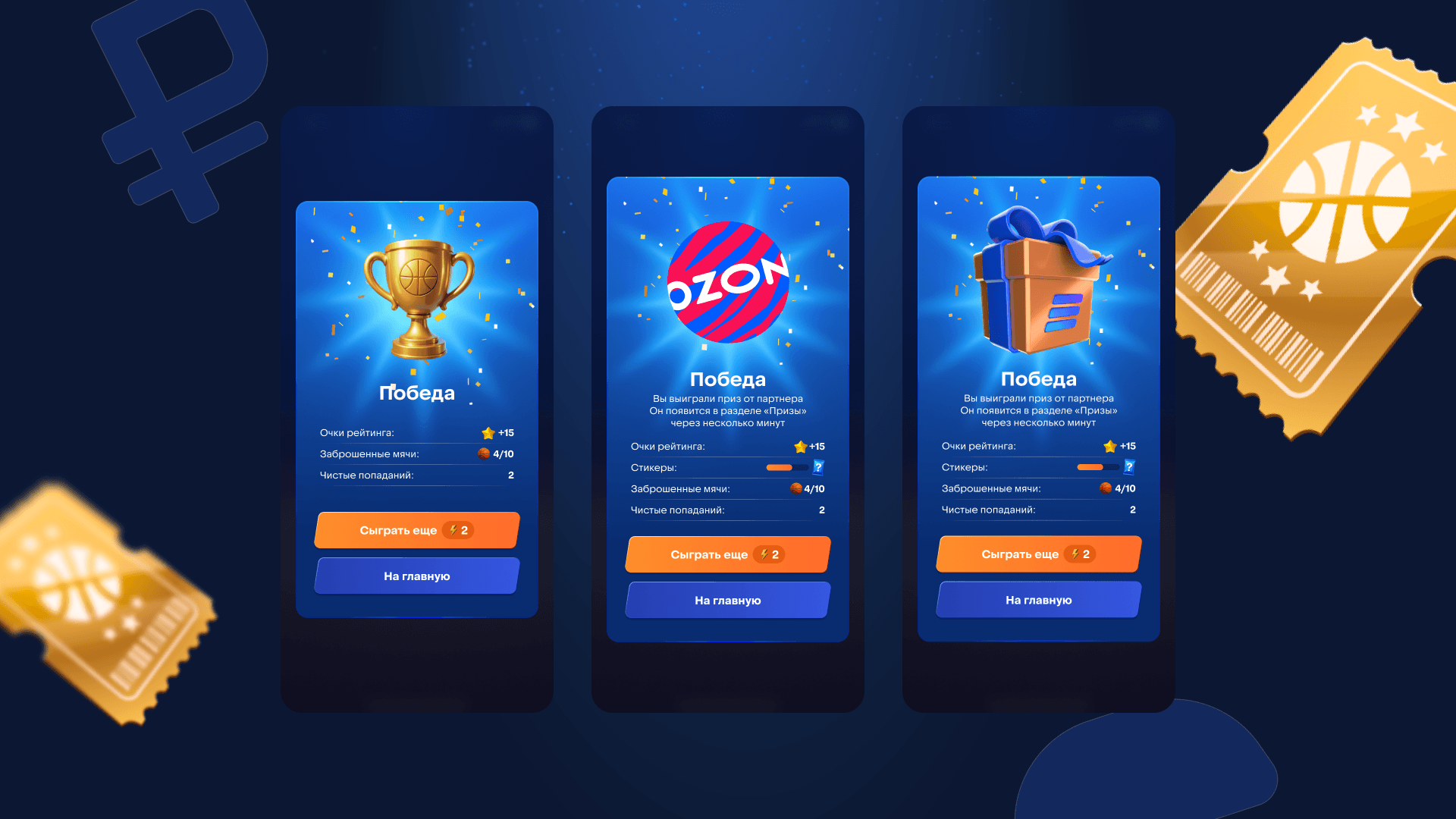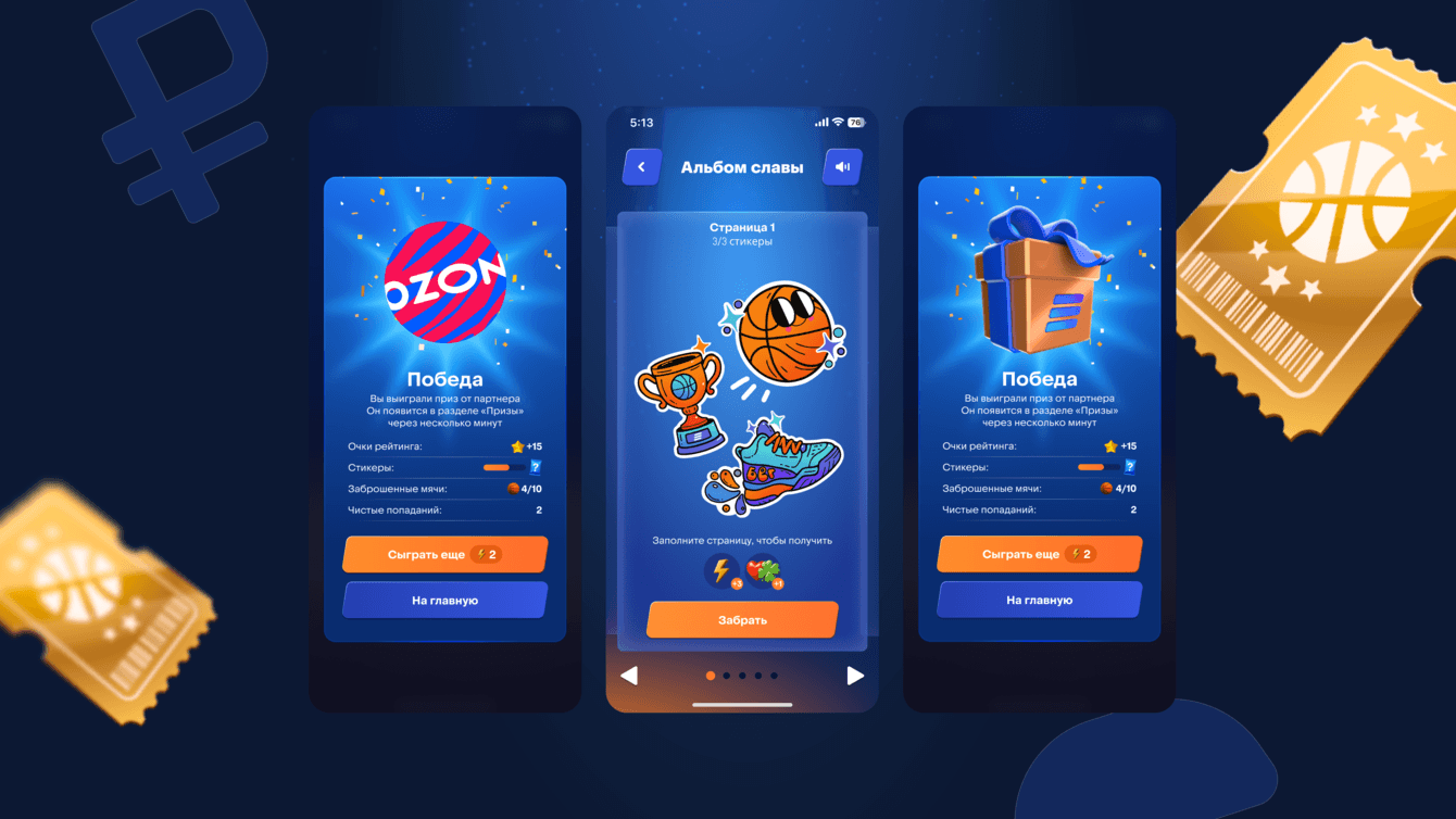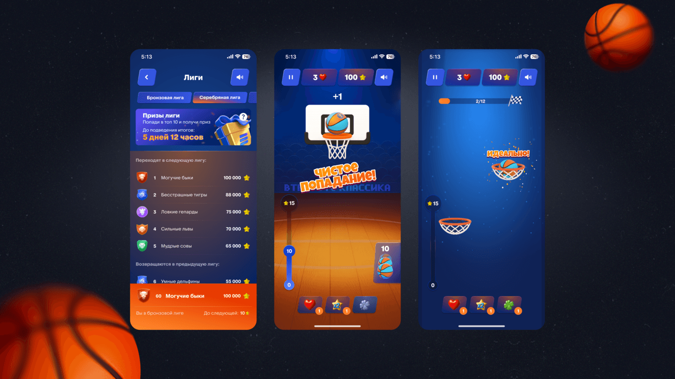 Итак, игрокам предстояло попасть в корзину виртуальным мячом, избегая препятствий и промахов, собирая очки за каждое попадание, бустеры и подарки от партнеров.