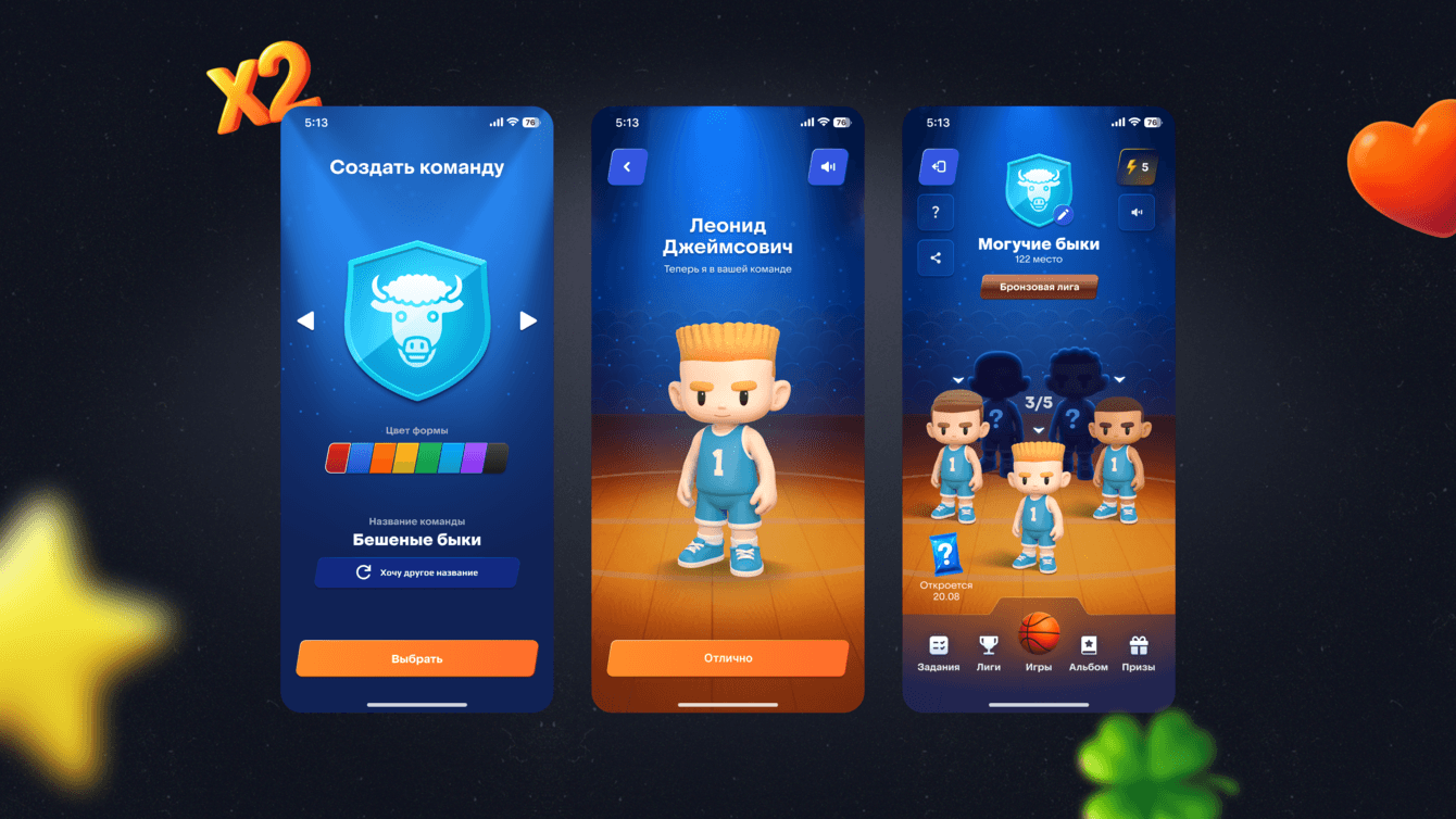 • Стратегия и коллекционирование. Клиент становился тренером собственной баскетбольной команды: выбирал название, цвет и ставил перед собой главную цель — собрать полный состав из 5 уникальных игроков. Каждый новый игрок не только усиливал команду, но и приносил дополнительные очки рейтинга, помогая быстрее подниматься в турнирной таблице.