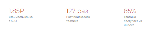 Стоимость клика с SEO составляет 1.85 руб. Для сравнения в Яндекс Директ цена клика более 70 руб.