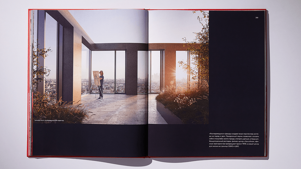 Цветовая доминанта — глубокий красный. Он превращает буклет в арт-объект, выделяя его среди стандартных девелоперских изданий.