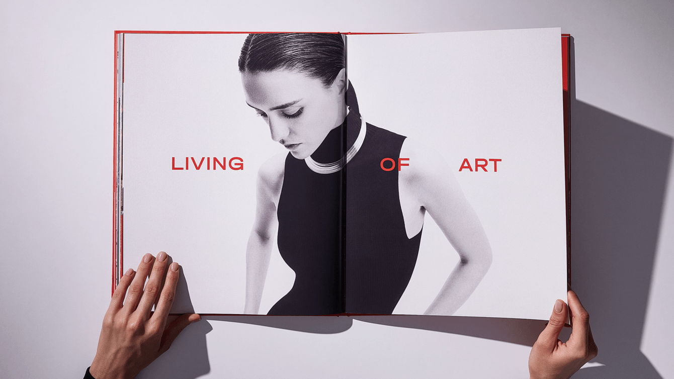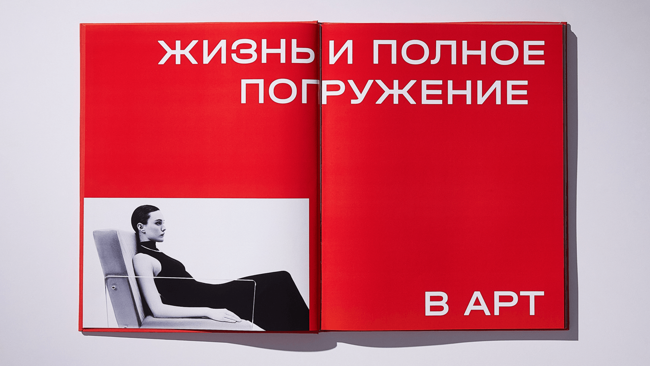 Формат музейного каталога. Издание строится как экспозиция: каждая страница — отдельный зал художественной галереи, каждый разворот — курация.