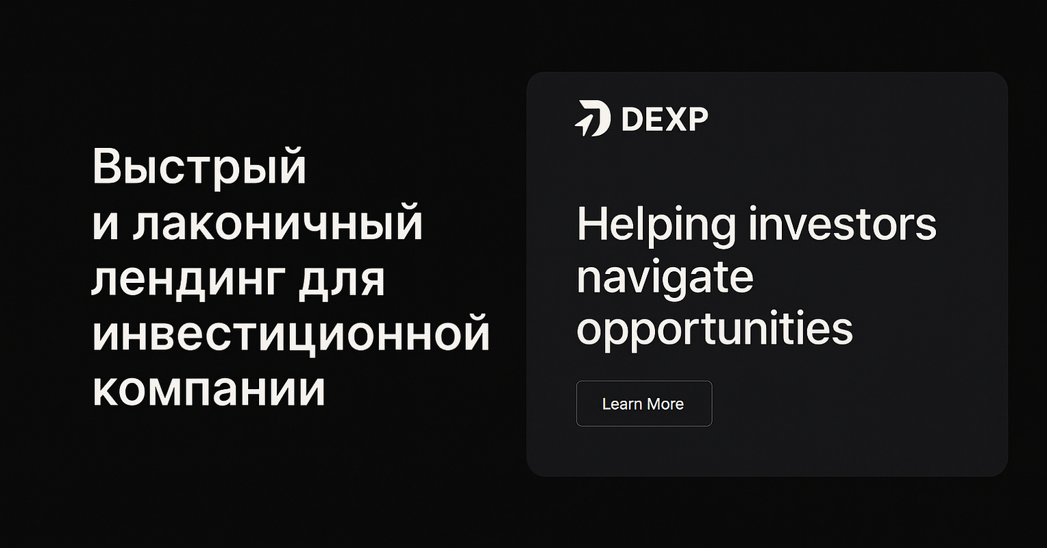 Инвестиционная компания DEXP обратилась с запросом на создание современного и лаконичного лендинга, который бы отражал их экспертность и вызывал доверие у частных и корпоративных инвесторов. Главный акцент нужно было сделать на простоте подачи и ясной коммуникации — без лишних деталей и сложных элементов.