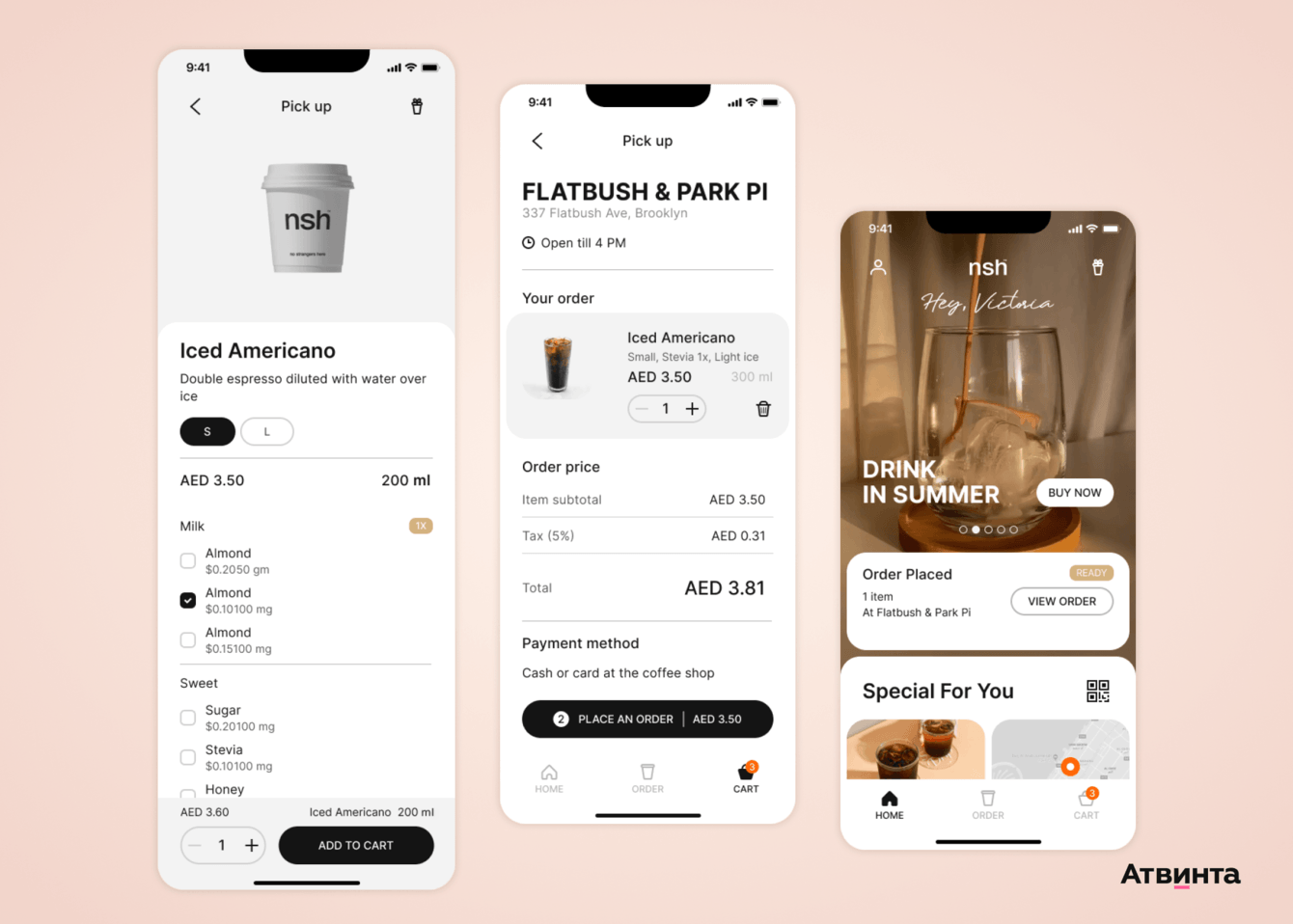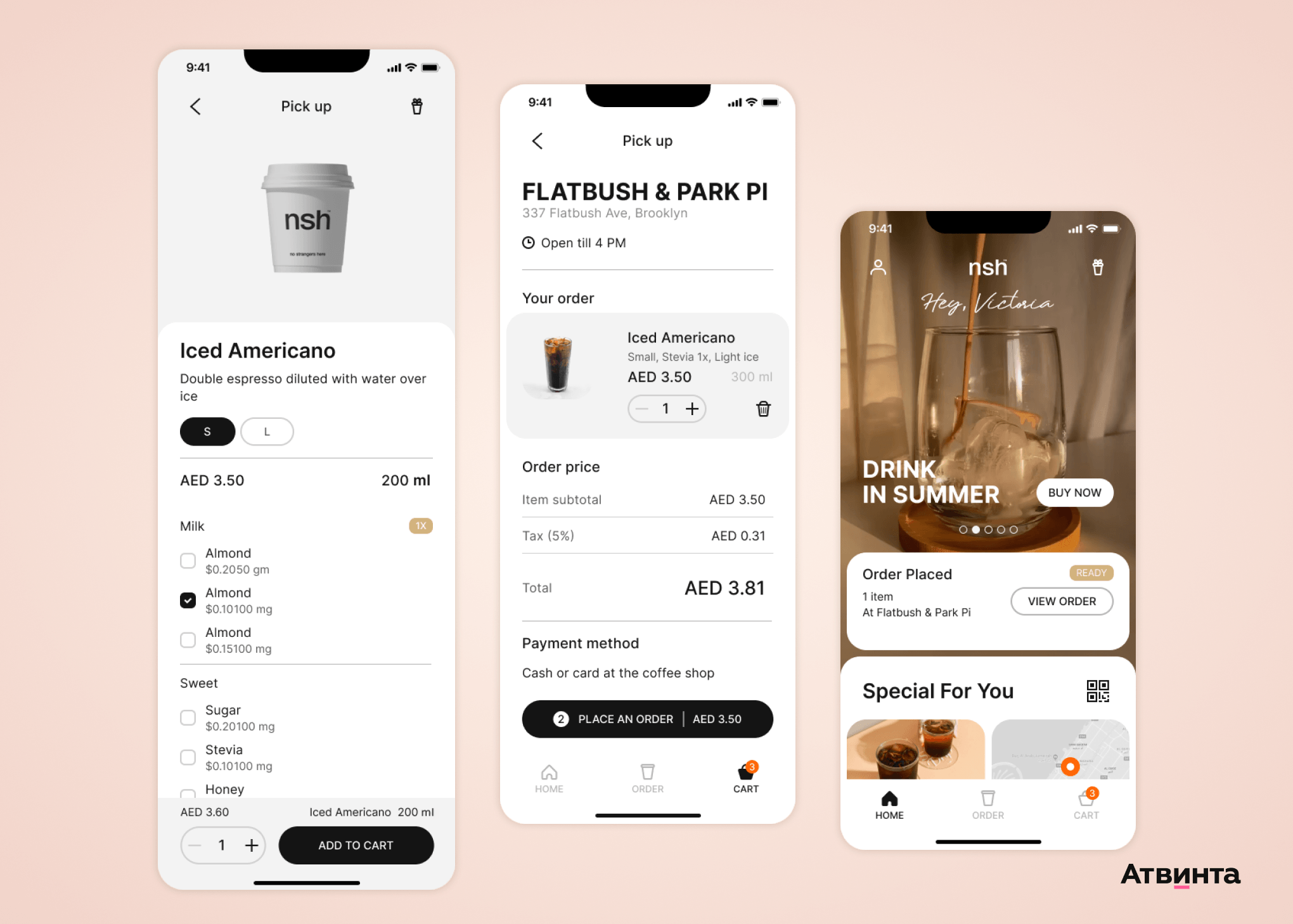 Заказчик обратился к нам за дизайном экранов мобильного приложения для кофейни в Дубае.