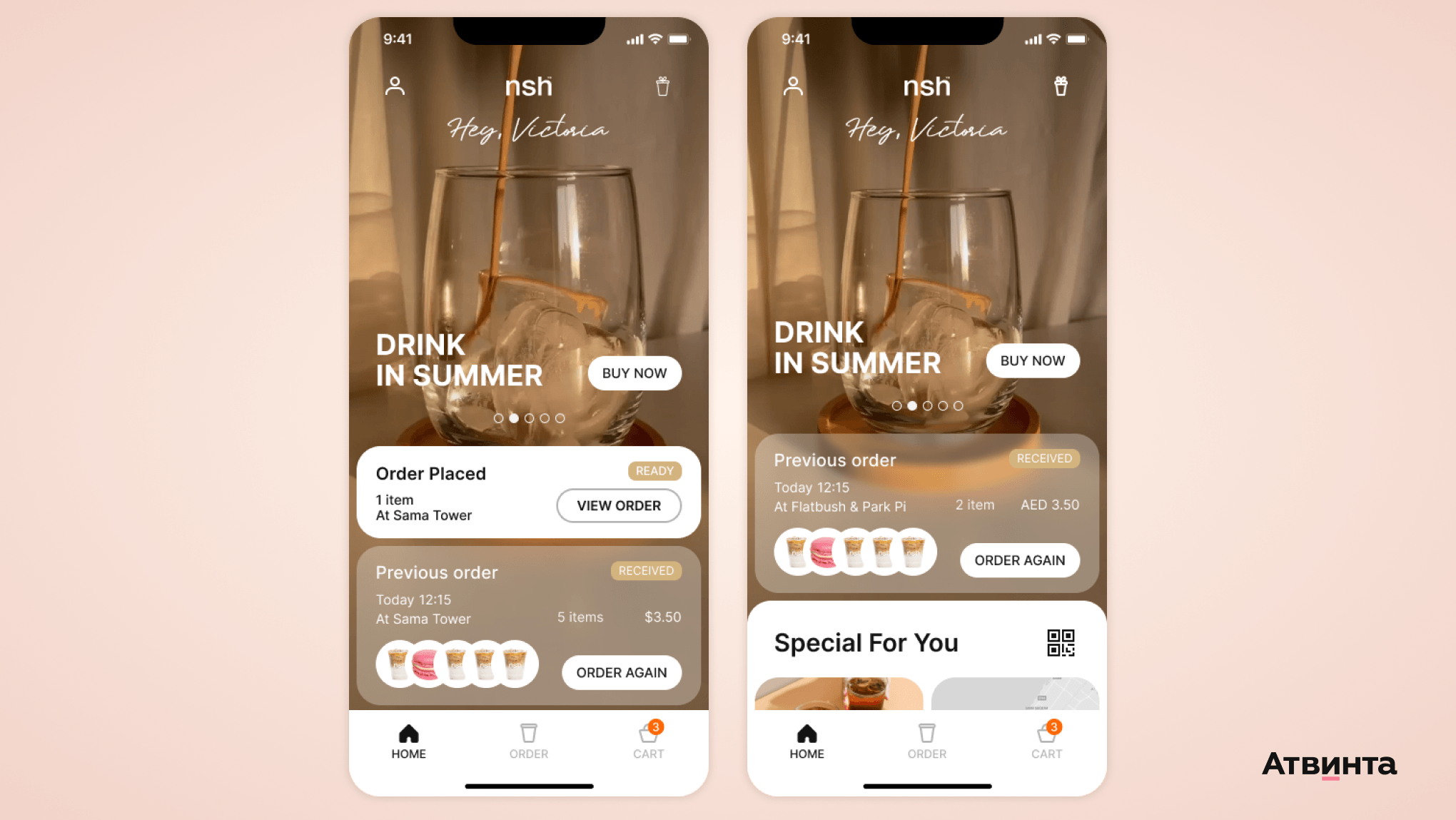 После получения напитка на домашнем экране будет отображаться выполненный заказ и товары, которые в нем были. Для удобства мы добавили функцию повторения покупки.