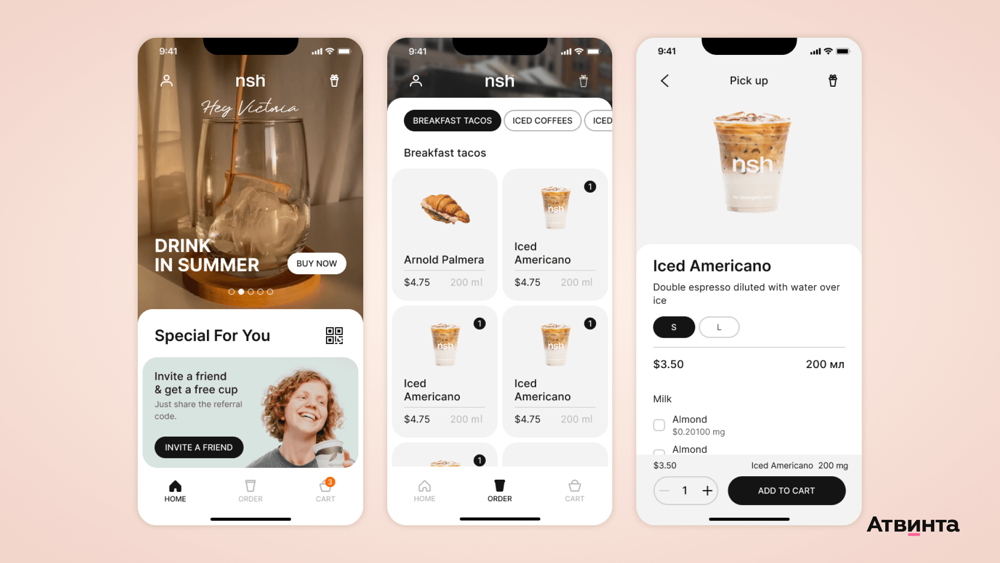 Нас попросили создать приложение, в котором гость сможет выбрать продукт, указать предпочтения (объем и добавки) и оформить заказ онлайн. При этом оплата происходит на кассе во время получения напитка — картой или наличными. Так приложение помогает клиентам экономить время, а кофейне — выстраивать быстрый и удобный процесс взаимодействия с гостями.