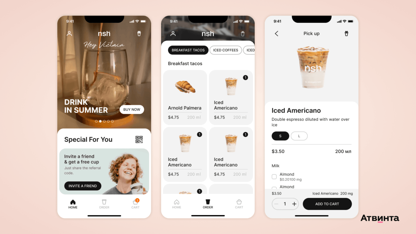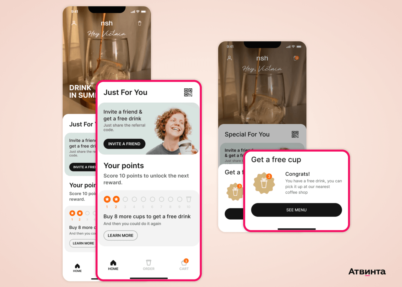 На домашнем экране в начале показываются сезонные предложения и истории, а затем — бонусная программа и акции. Например, клиент может привести друга или набрать отметки за заказы — и получить напиток в подарок. Приложение дает возможность клиентам накапливать бонусы. Все привилегии хранятся в одном месте и под рукой. Подобное внимание к деталям подчеркивает клиентоориентированность кофейни.