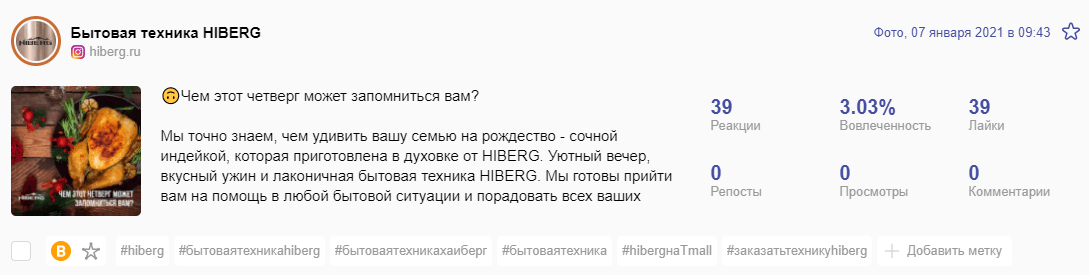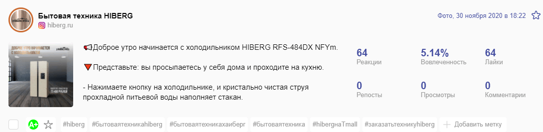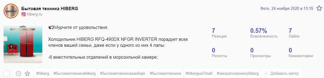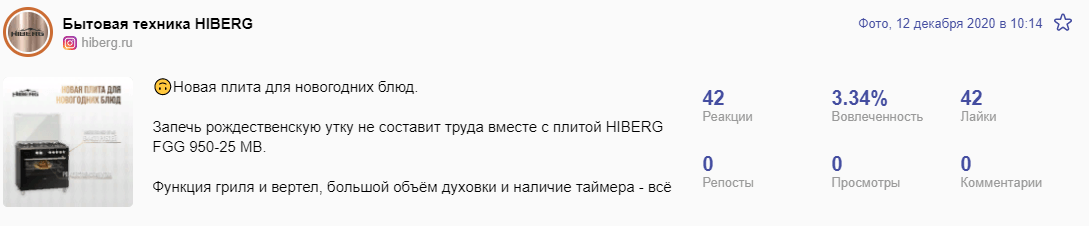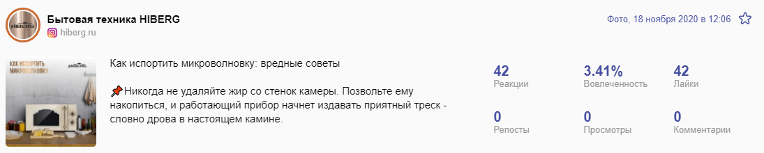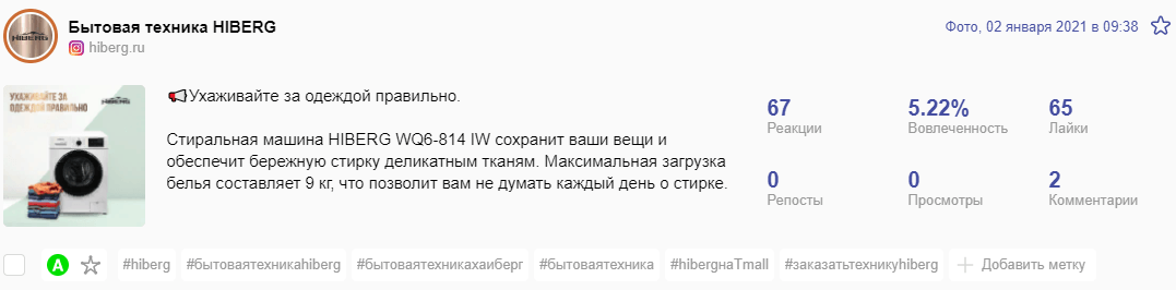 Делали уклон на конкретные продукты и их преимущества. Первое место по показателям вовлечённости получил пост про описание стиральной машинки.