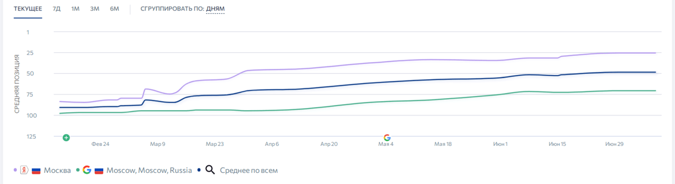 График средней позиции в поисковых системах в первые 6 месяцев продвижения, когда был показан основной рост: