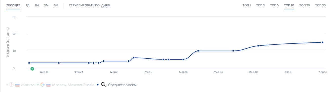 Особенно стоит отметить очень быстрый рост по запросам в ТОП-10 за первые 2,5 месяца. График % запросов в ТОП-10 по Яндекс и Google за этот период: