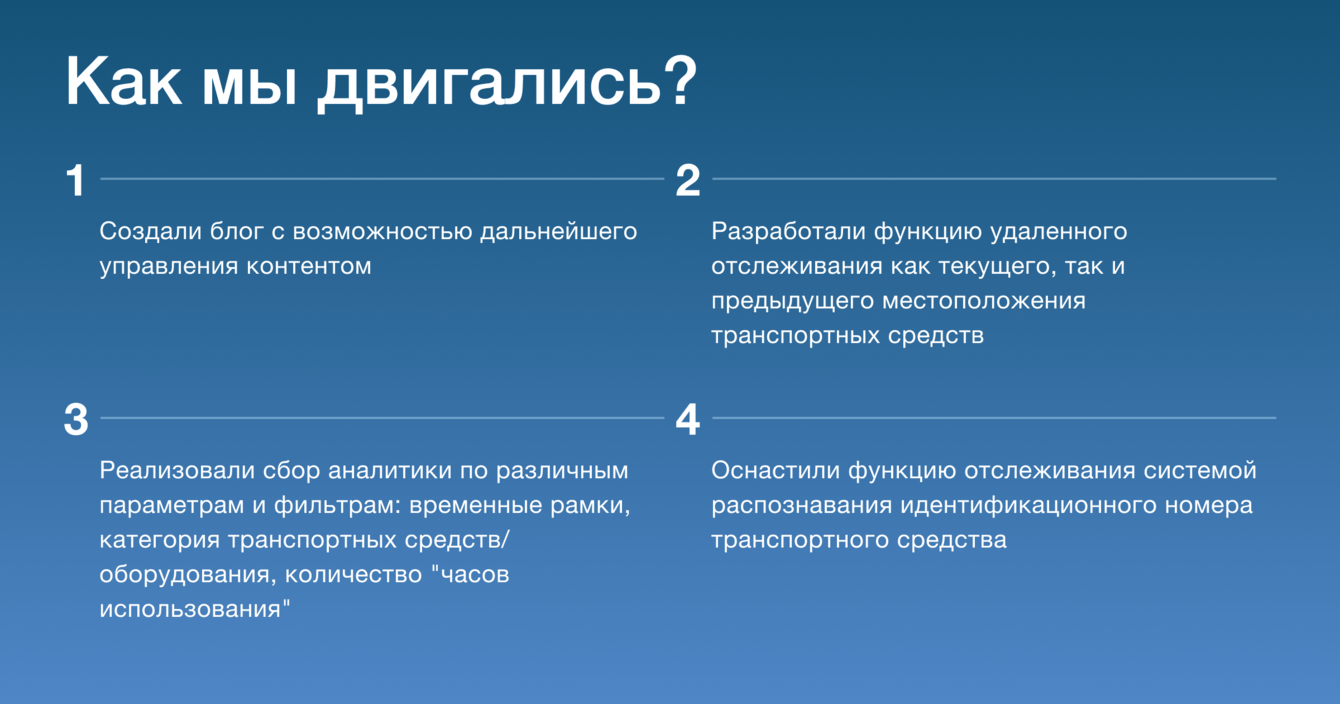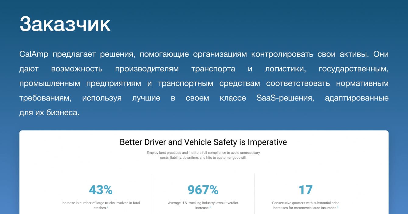 Платформа собирает все данные о состоянии и местоположении транспорта через системы GPS, чтобы можно было отслеживать его эффективность и быстрее устранять поломки. Она использует аналитику в реальном времени для оптимизации ресурсов и улучшения обслуживания клиентов для предприятий в строительстве, транспорте и многих других областях.