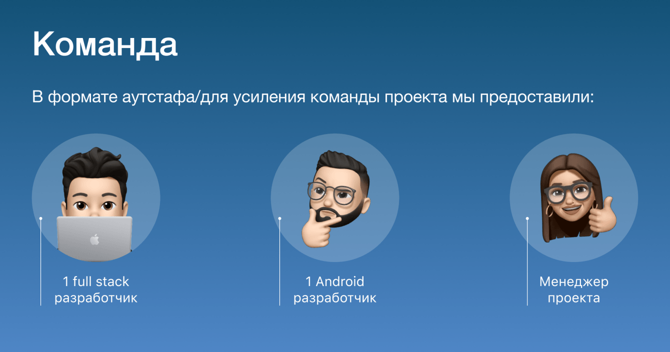 Мы подключились к команде на стадии частичной готовности и быстро взяли на себя часть процессов и задач. После нашего бесшовного присоединения работа команды ускорилась для быстрого вывода проекта на рынок.