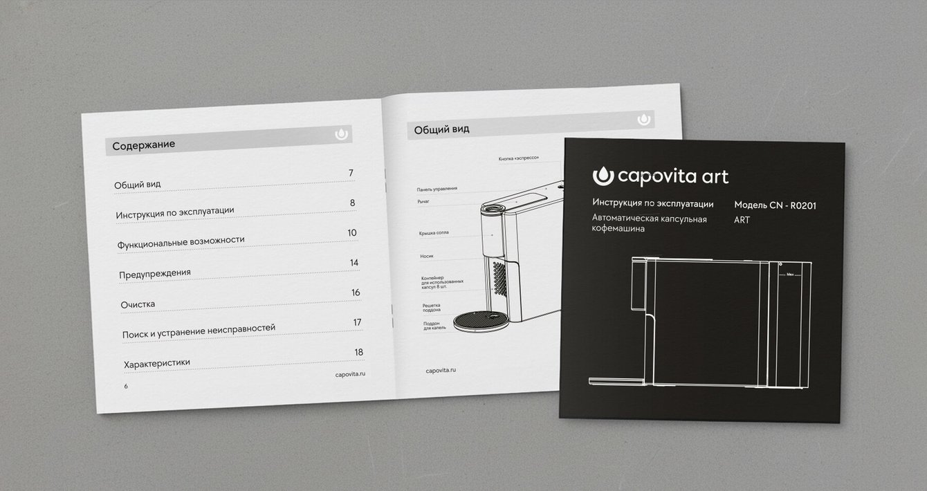 Дальше — дисциплина, без которой маркетплейсы быстро превращаются в квест. Мы подготовили правила и макеты для брендирования техники, упаковок, инструкций и логистики, чтобы CAPOVITA одинаково собранно выглядела и на коробке кофемашины, и на транспортной наклейке. И да, мы официально запретили «креативные» градиенты в логотипе — не потому что мы зануды, а потому что узнаваемость дороже минутного вдохновения.