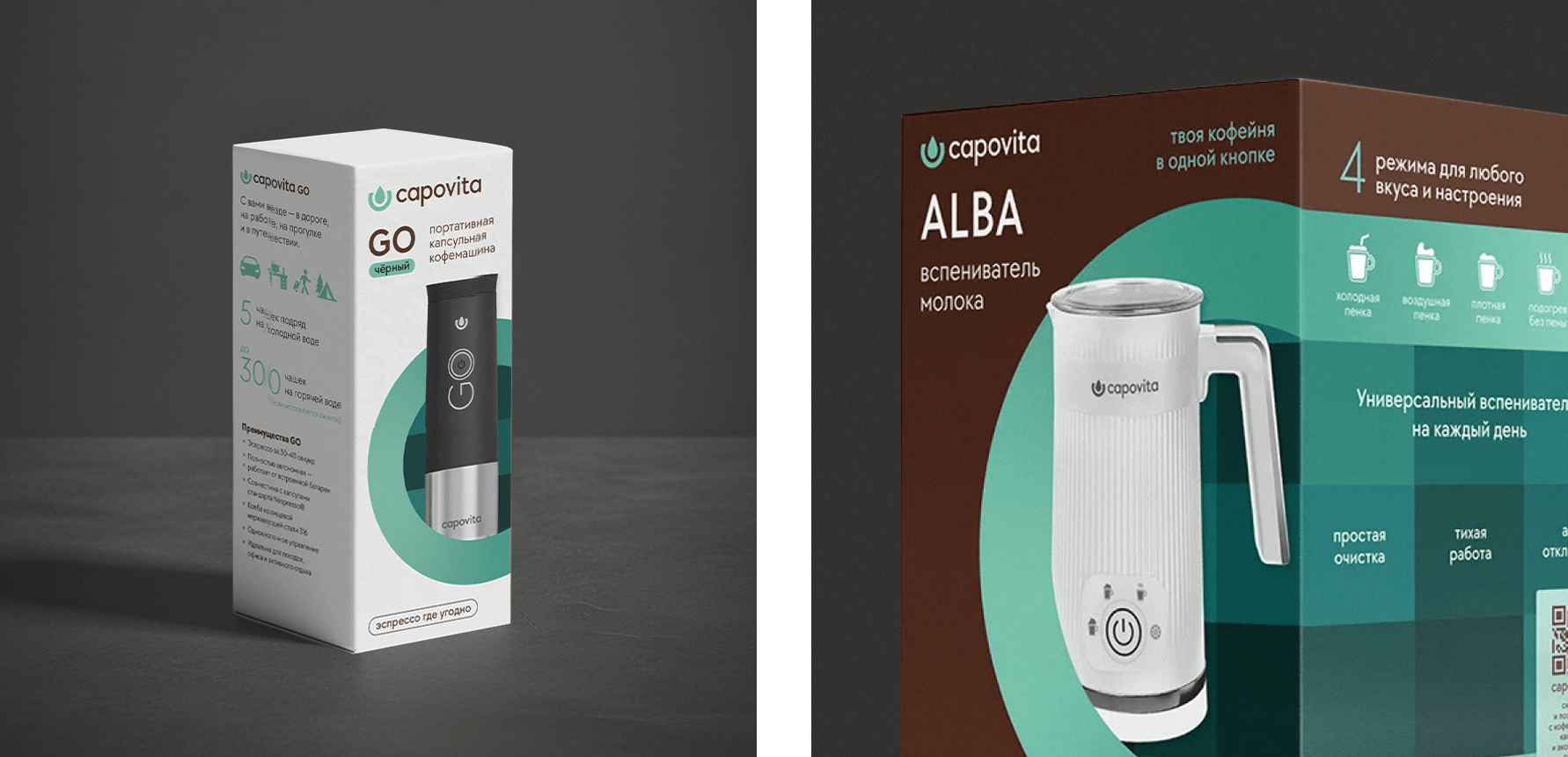 CAPOVITA — зонтичное имя для экосистемы, под которым легко растут линейки. Внутри системы появились понятные имена устройств и аксессуаров: кофемашины Capovita Art, Capovita Phantom, Capovita Phantom Pro и портативная Capovita GO, вспениватели ALBA и BRUMA. Когда названия не притворяются поэзией, а честно работают навигацией, жить становится проще всем — и бренду тоже.