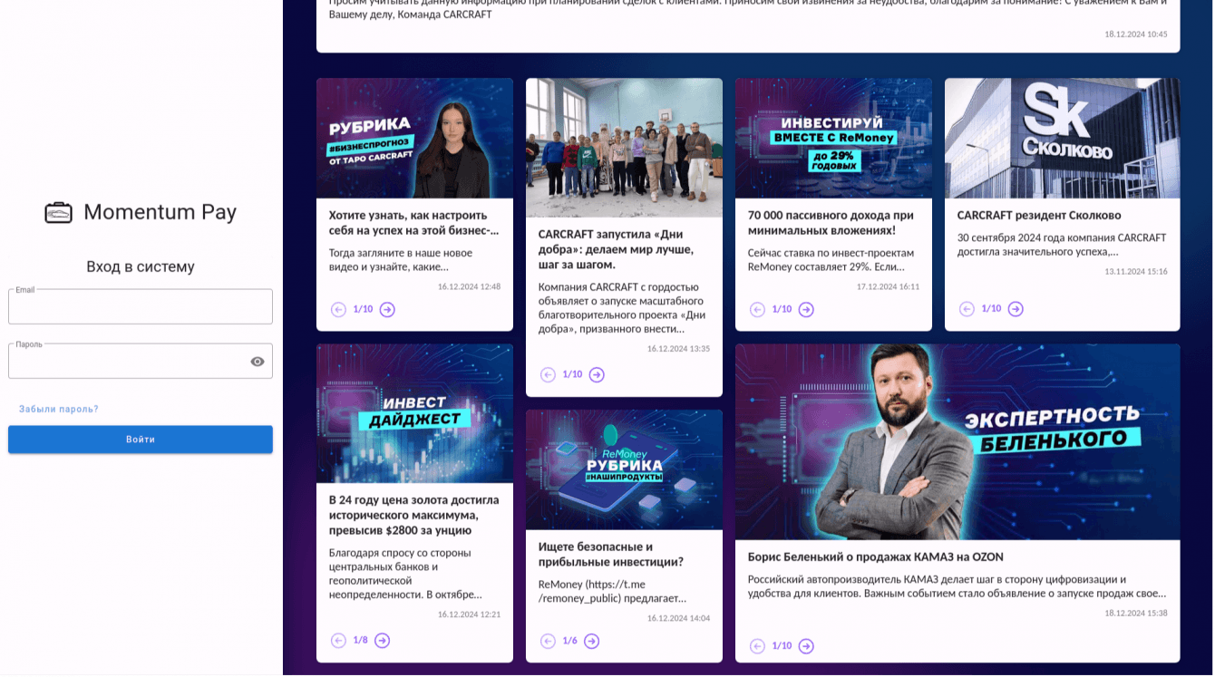 Новостной блок уже интегрирован в главную страницу их платёжного сервиса Momentumpay от CarCraft. Посмотреть на него можно здесь: momentumpay.ru