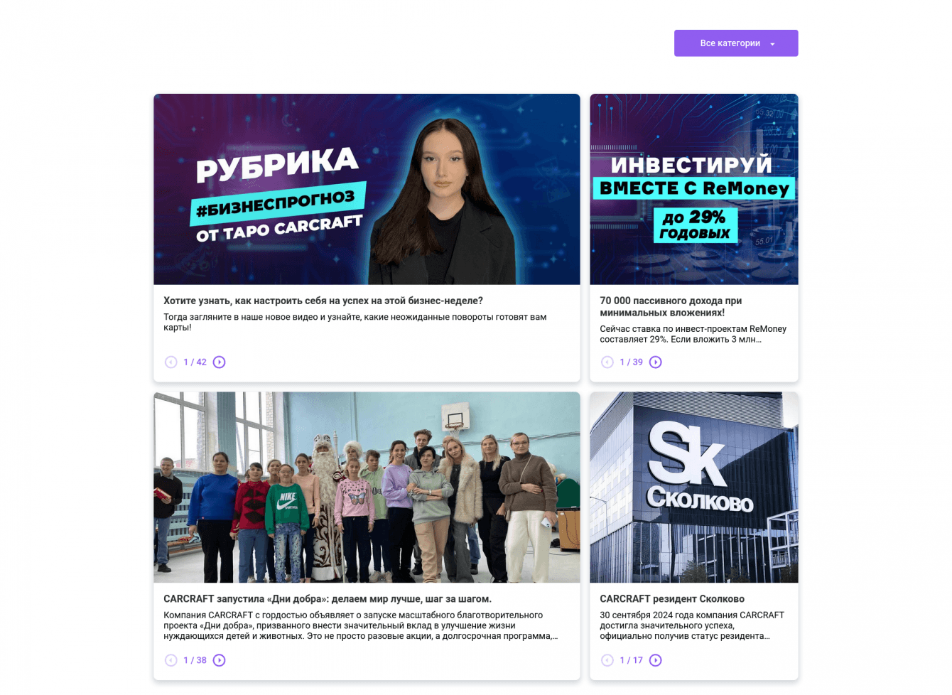 В целях повышения вовлечённости пользователей в жизнь компании для увеличение количества ап-сейлов и кросс-сейлов было принято решение сделать единый хаб всех медиа-площадок компании, контент из которого можно было бы размещать в сервисах CarCraft.