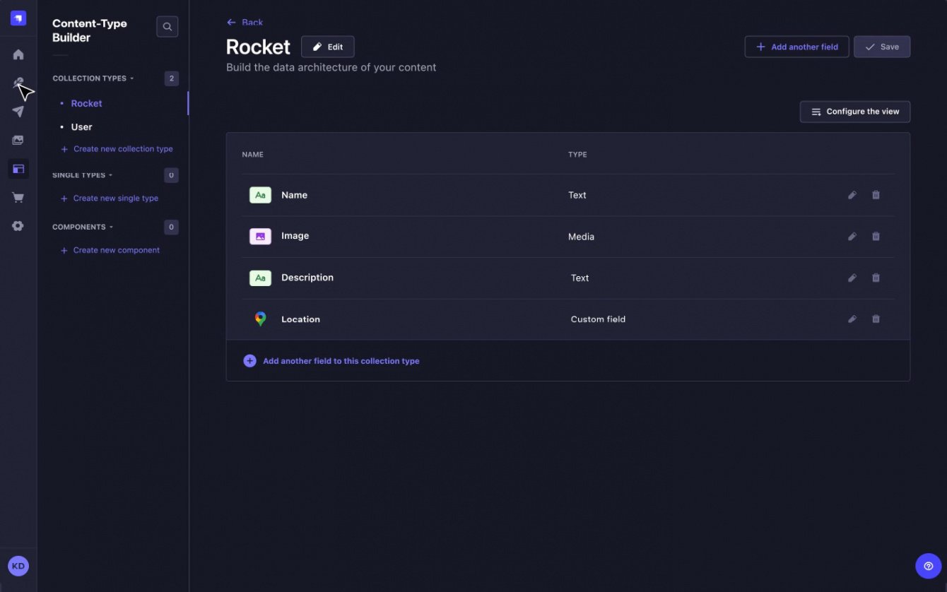*Strapi переведён на русский язык, но поля, которые создаются при добавлении таблиц, необходимо в ручную перевести на русский.