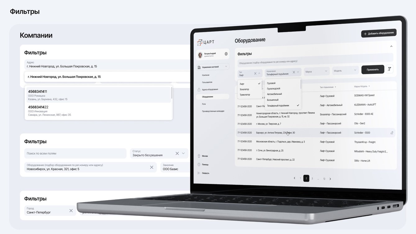 Отрисовали более 500 экранов (десктоп + адаптив), предусмотрели гибкую фильтрацию, чтобы инженеры могли находить нужные лифты за пару кликов.