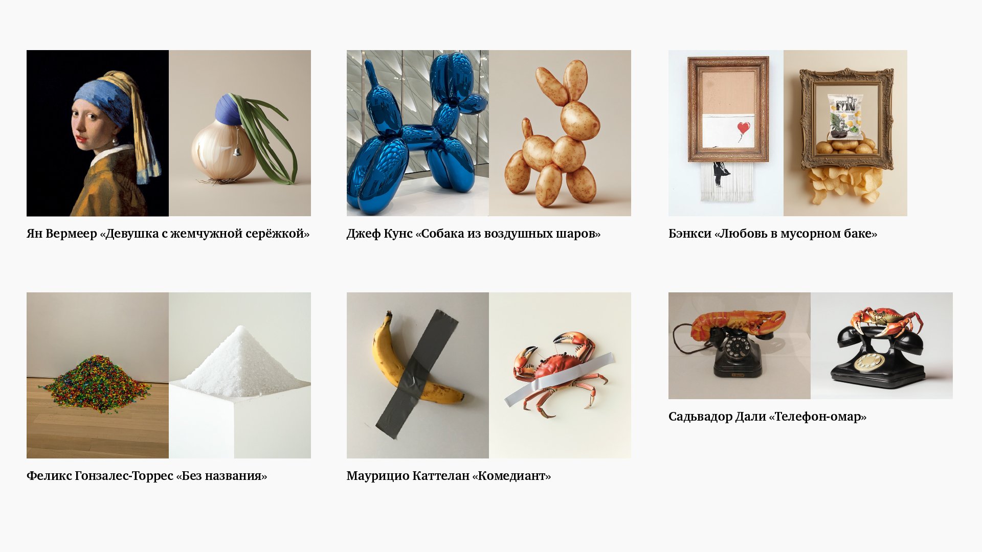 Основой концепции стали сюрреалистичность и абсурдность, характерные для бренда. Для этого мы искали отсылки из узнаваемых работ современного и классического искусства и находили в них новые образы и смыслы. Так мы создали серию баннеров, где «главными героями» стали ингредиенты, из которых состоят чипсы. «Еда или искусство?» – вопрос, на который бренд предлагает найти ответ каждого зрителя.