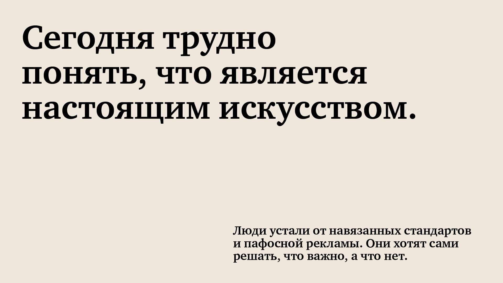 В первую очередь мы провели работу над коммуникационной стратегией бренда. В ней были сформулированы характер, тональность и главные смыслы коммуникации, которые в дальнейшем легли в основу нашей концепции. Также было важно учесть культурные особенности Чеченской Республики и адаптировать дерзкость и абсурдность бренда под креативные, но при этом ясные и понятные для региона образы. Так мы разработали креативную концепцию с главной идеей неоднозначности искусства – кто-то видит и восхищается им, кто-то не понимает и отвергает. Сам бренд задаётся вопросом «Искусство ли это?» и предлагает каждому найти на него свой собственный ответ.
