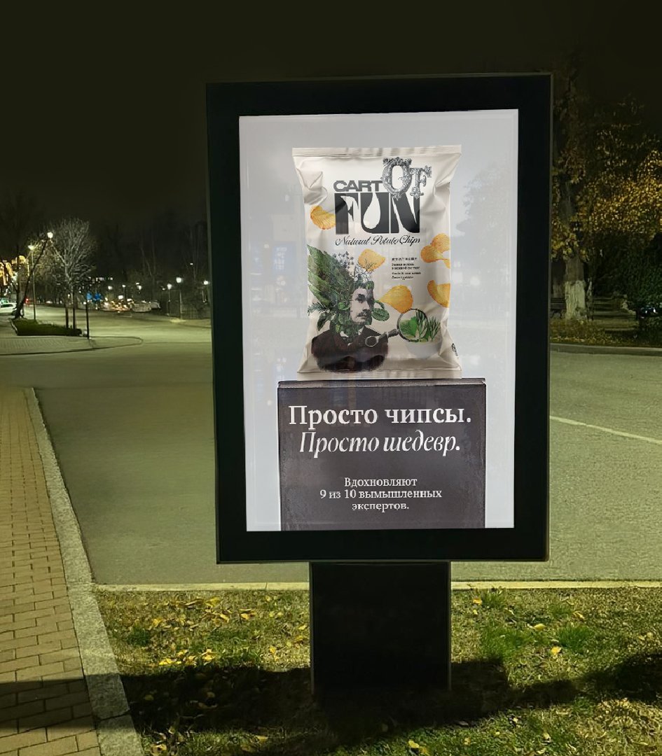 CartOfFun — это бренд чипсов, который превращает обычный перекус в объект постиронии, приглашая зрителей взглянуть на мир под другим углом. Как и в современном искусстве, здесь нет готовых ответов: это всего лишь чипсы... или нечто большее?
