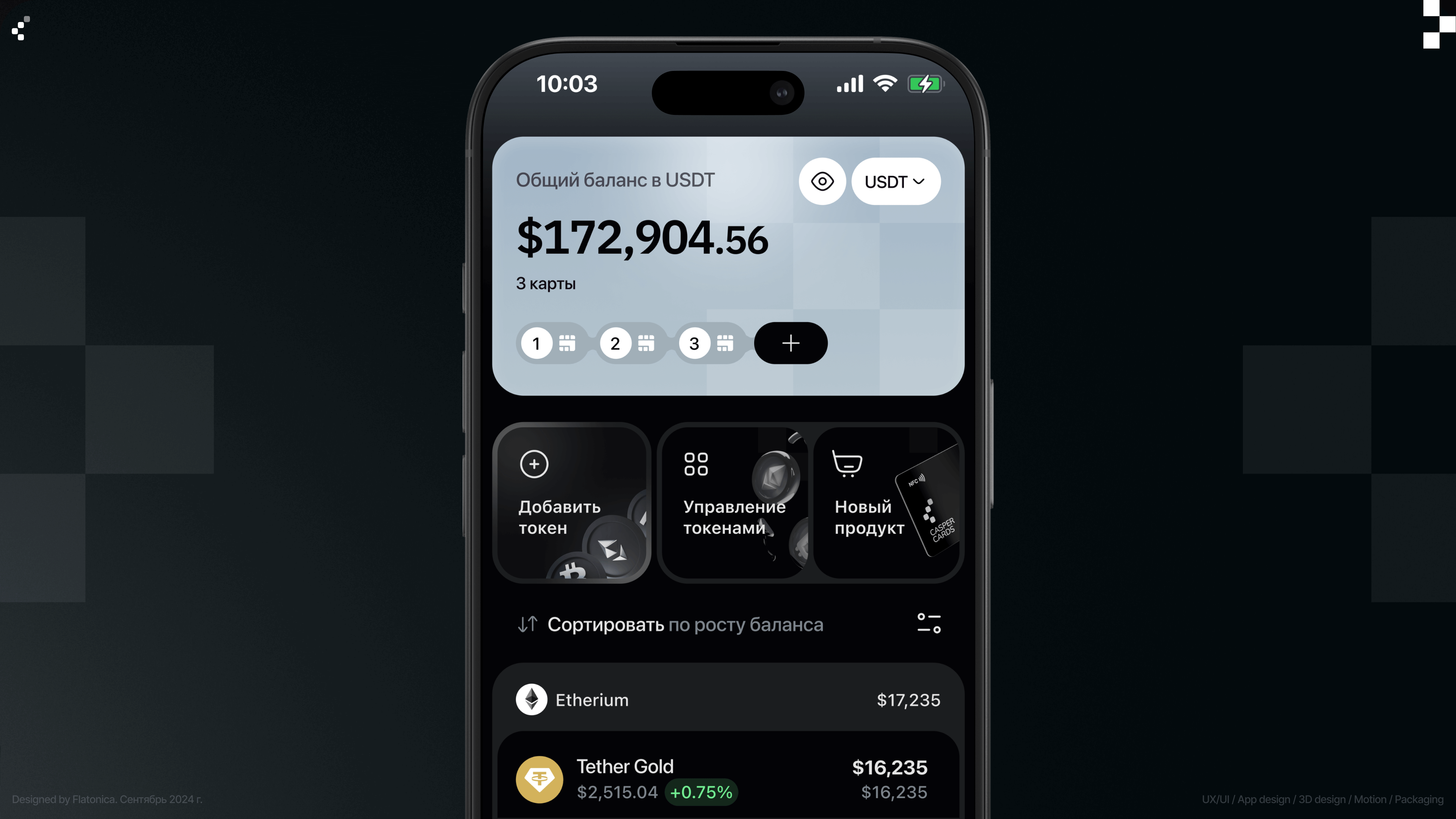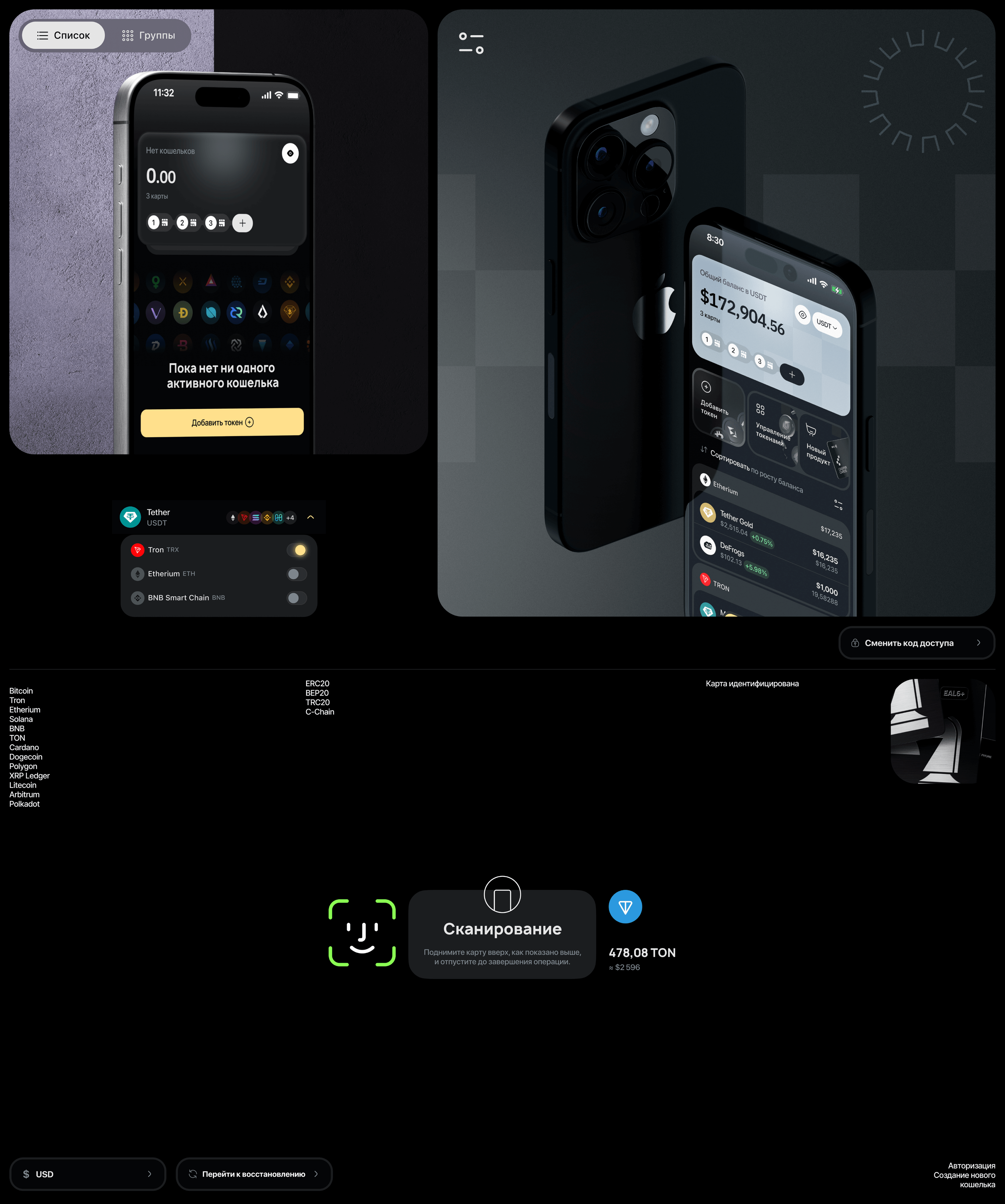 После установки и сканирования карты при помощи телефона с поддержкой NFC, пользователю предлагается добавить активы для организации портфеля в приложении. После процедуры добавления активов, интерфейс преобразится из "нулевого" в заполненное состояние, с перечнем активов, курсом валют и последними изменениями за 24 часа.