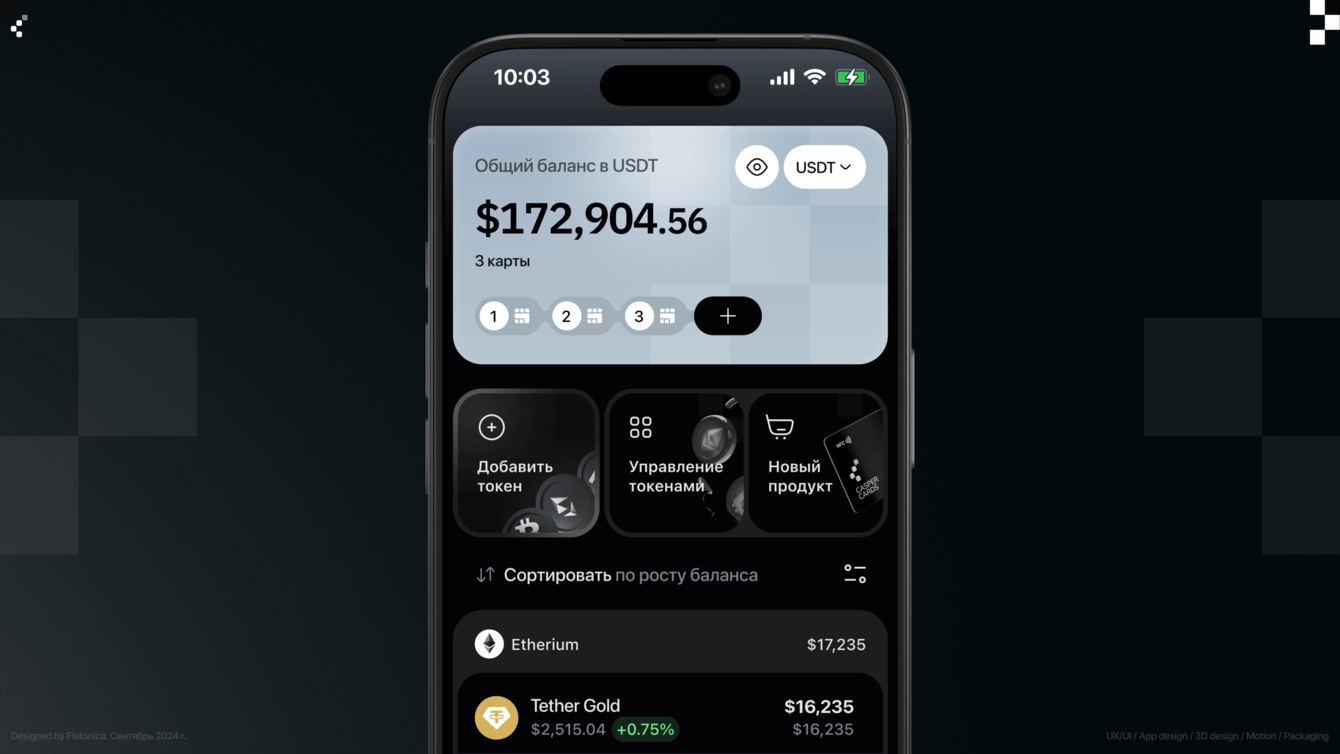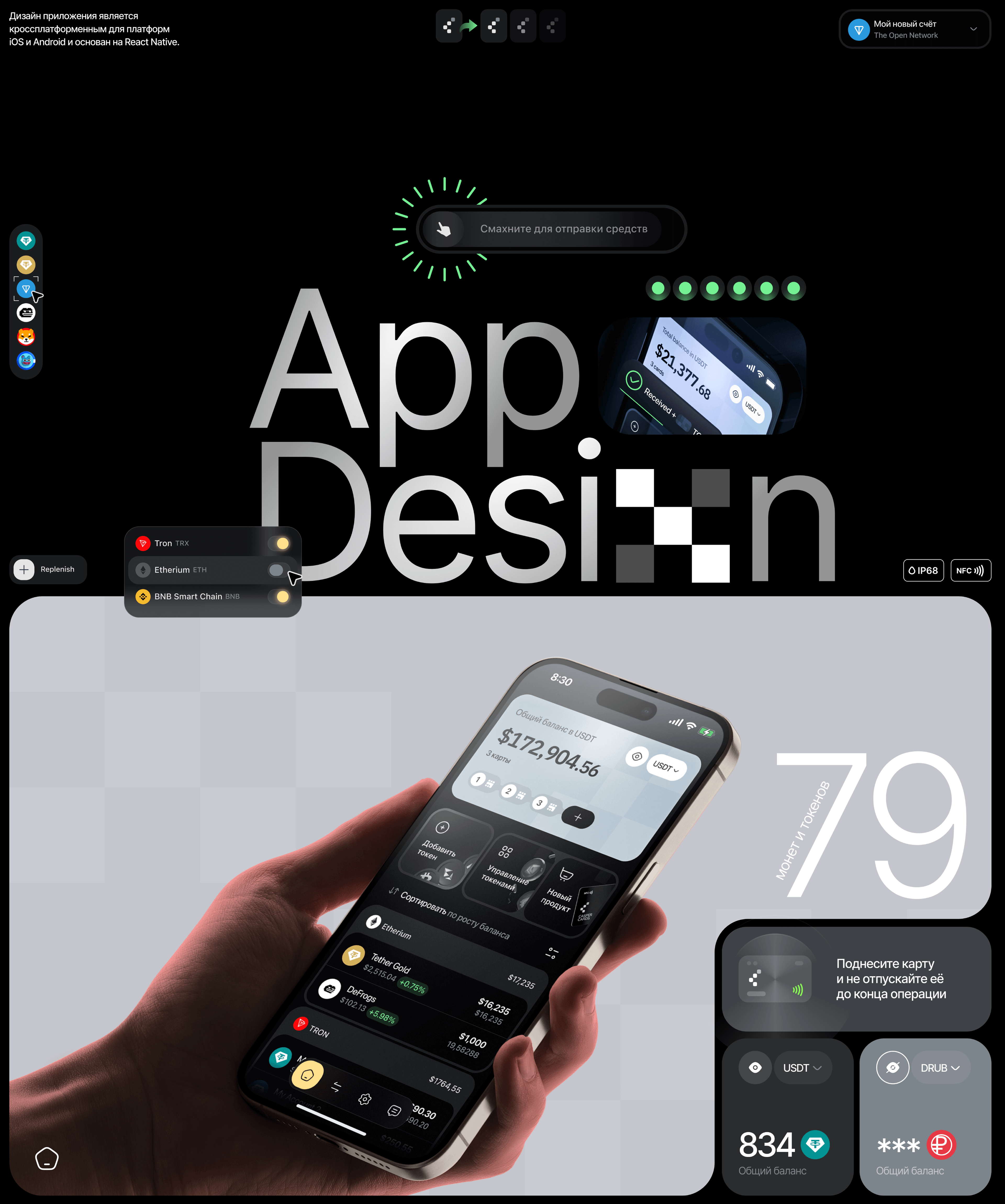 Главный экран содержит прямоугольный блок напоминающий дебетовую карту с общей суммой цифровых активов, перечнем иконок активированных карт к счёту в виде NFC-чипов и выбора валюты для конвертирования и отображения активов на главном экране. В интерфейсе также предусмотрена возможность сортировки токенов по параметрам, например, по возрастанию активов. При первом визите в приложение, пользователю предлагается добавить токен для хранения и управления цифровыми активами.