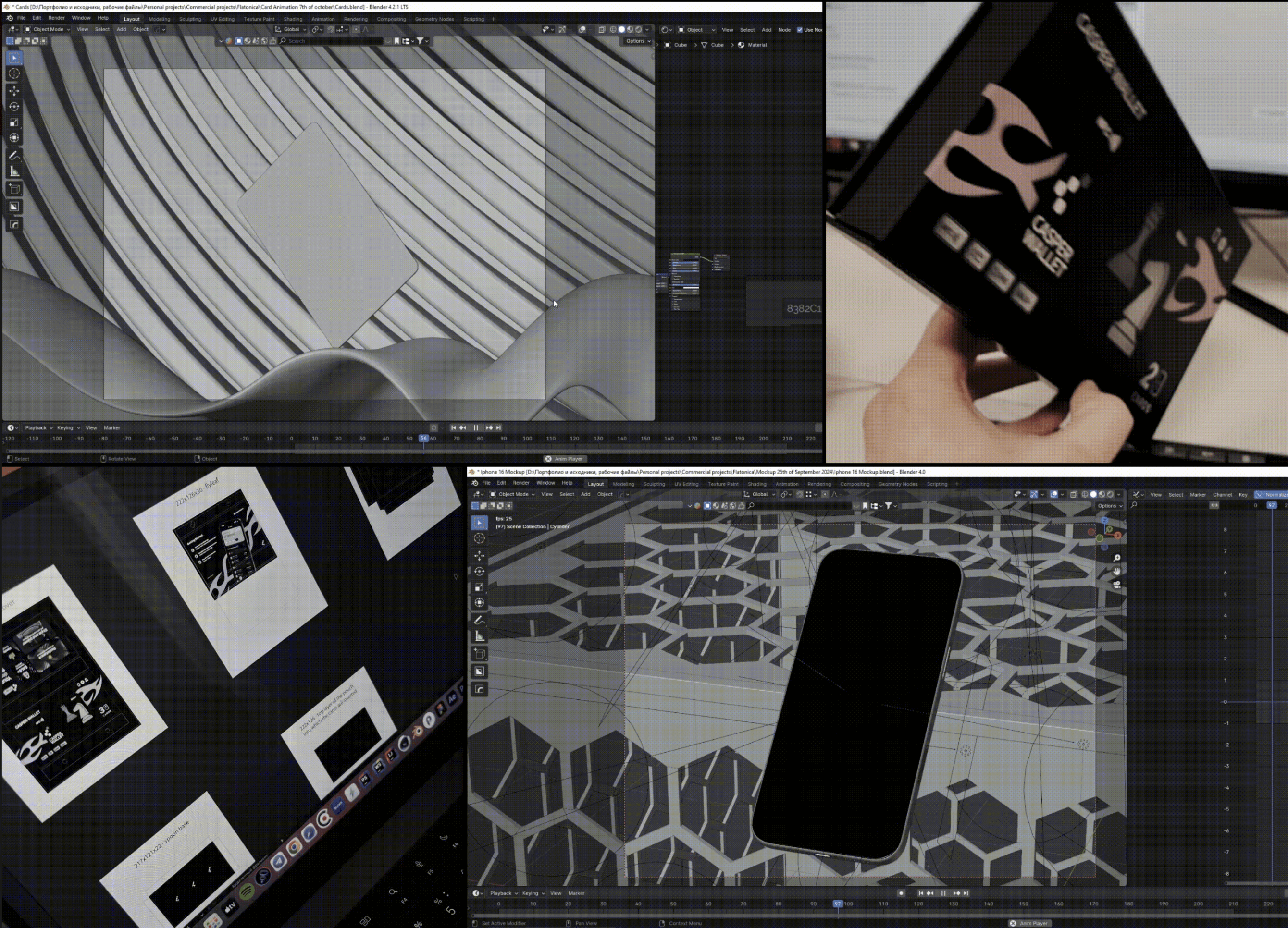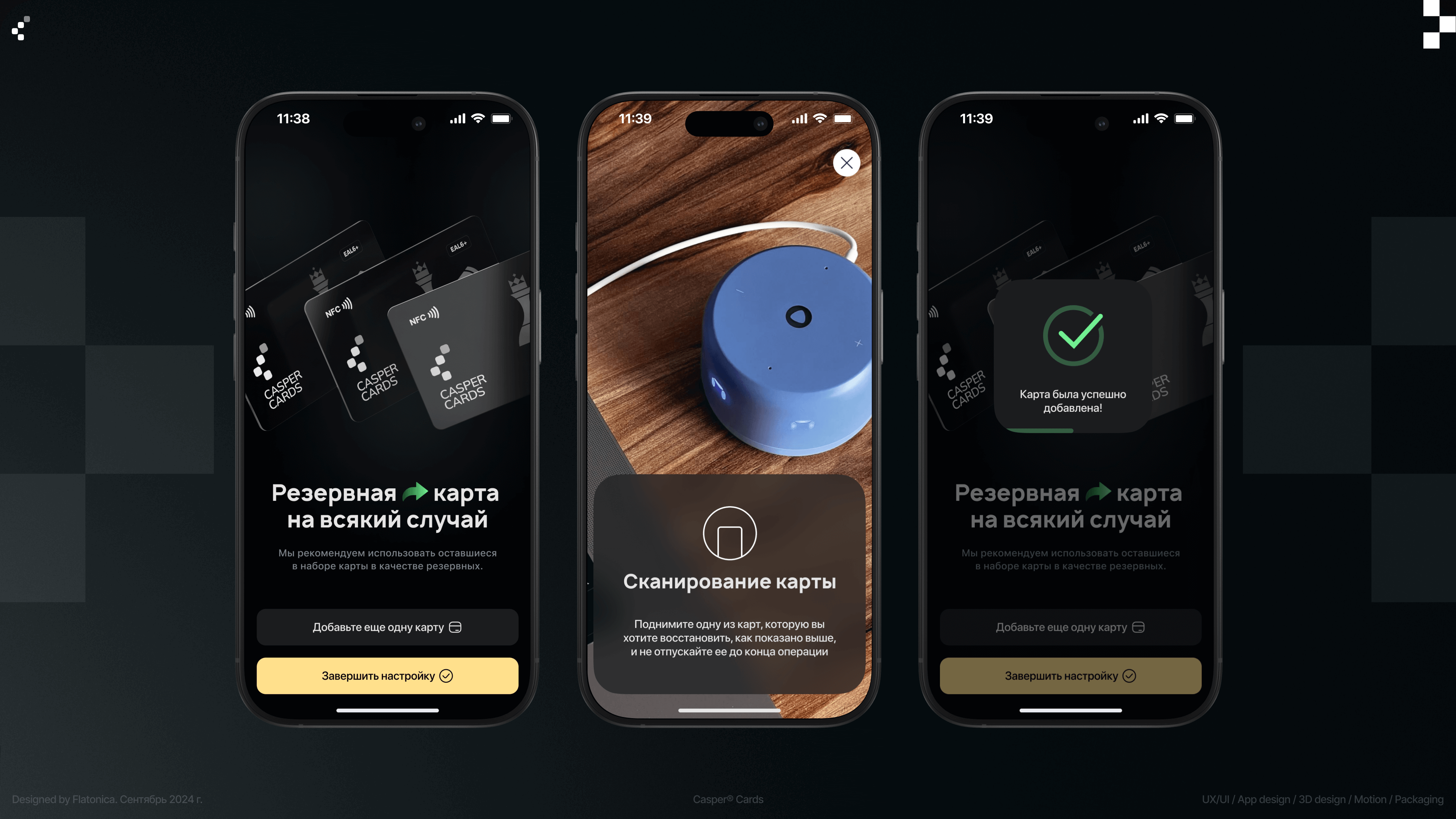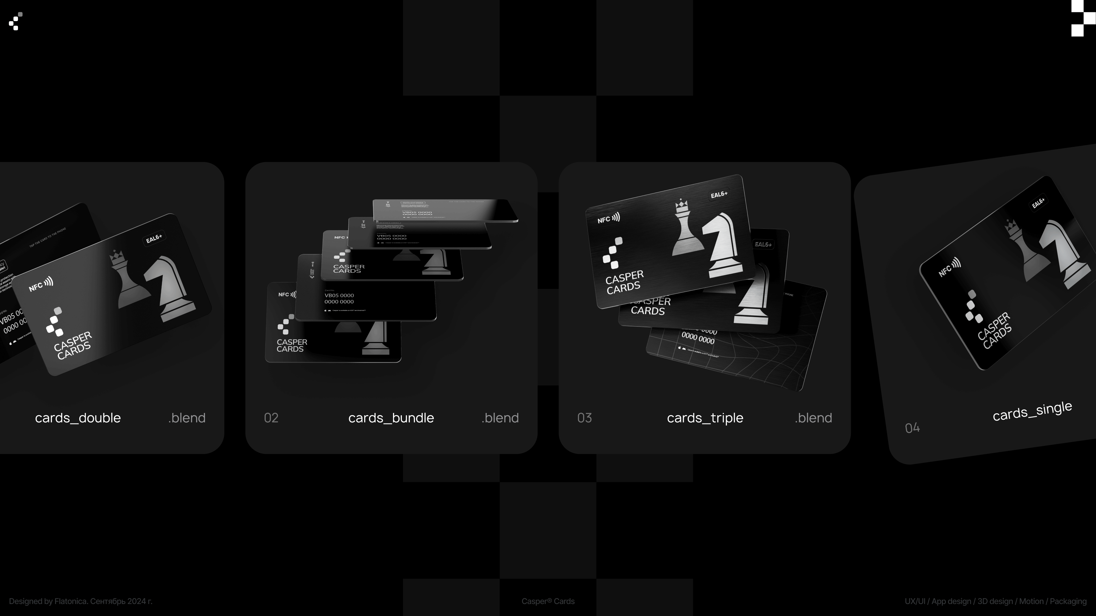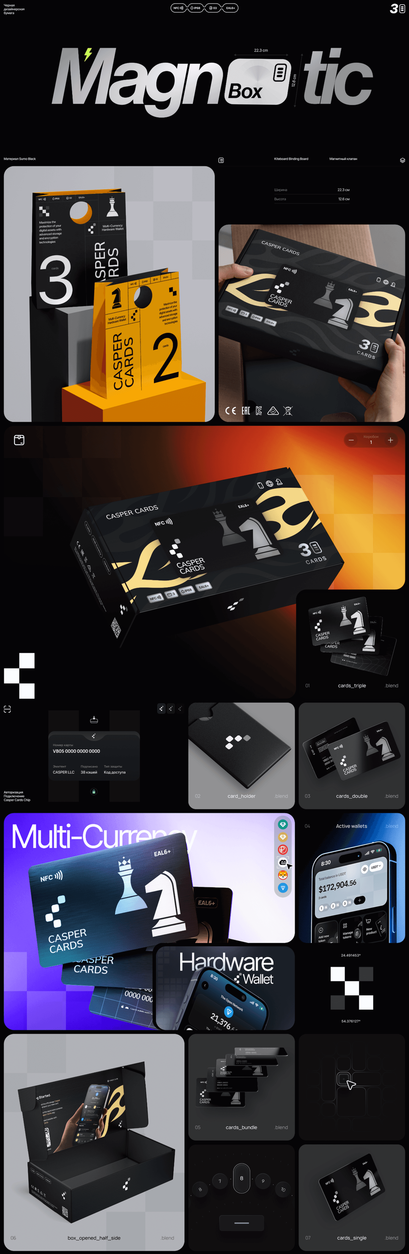 Несколько кадров работы над анимацией элементов продукта и пробный экземпляр коробки Casper Cards из типографии. Шоурил и другие анимации в проекте, создавались в Blender3D и в After Effects.