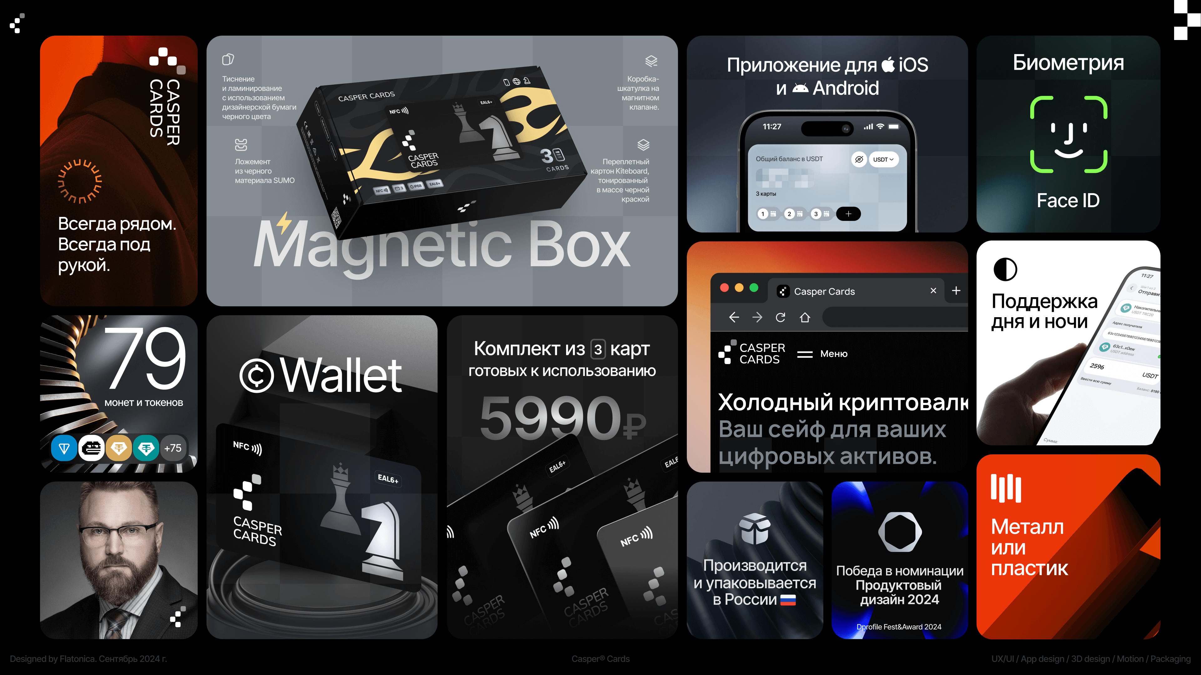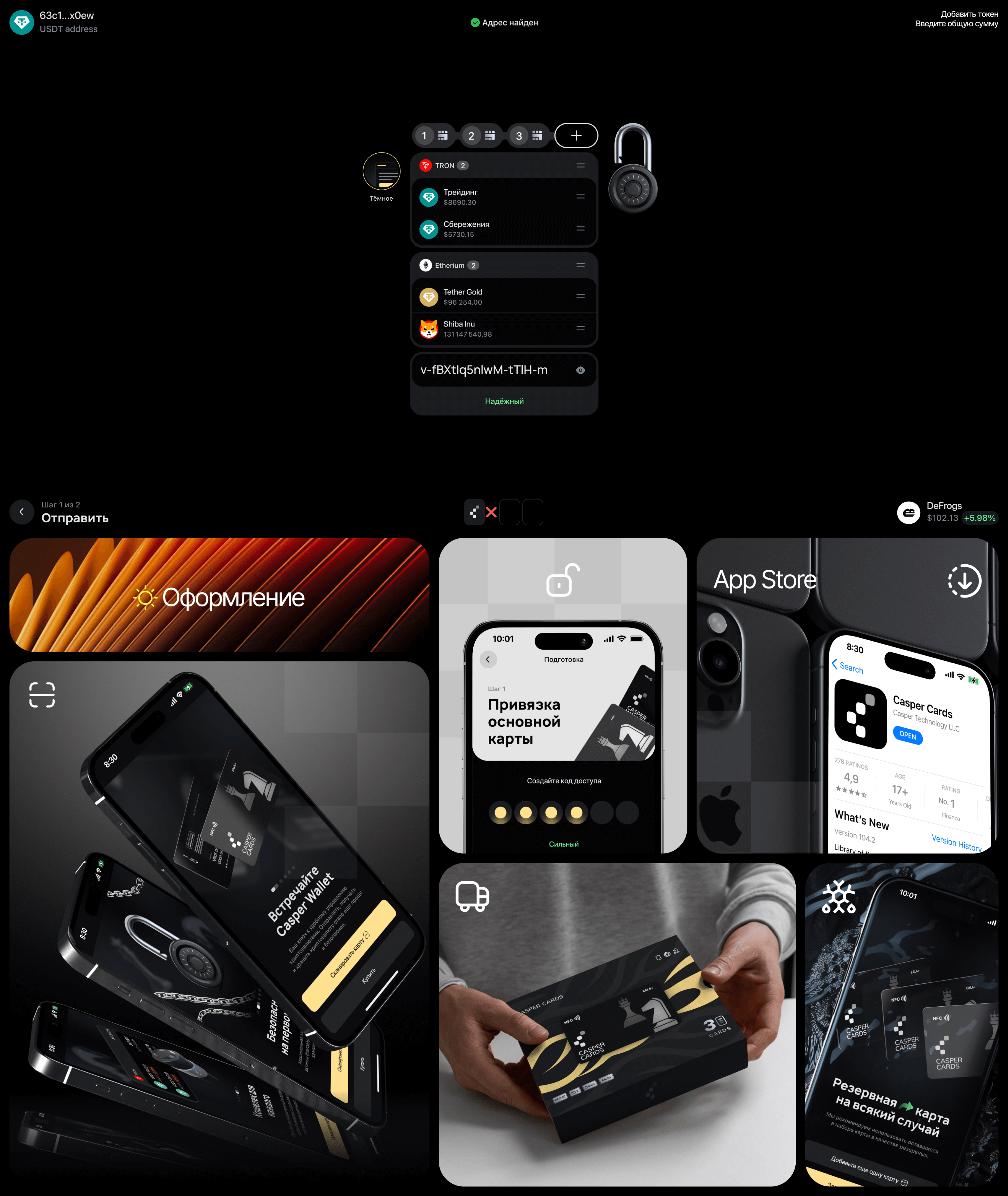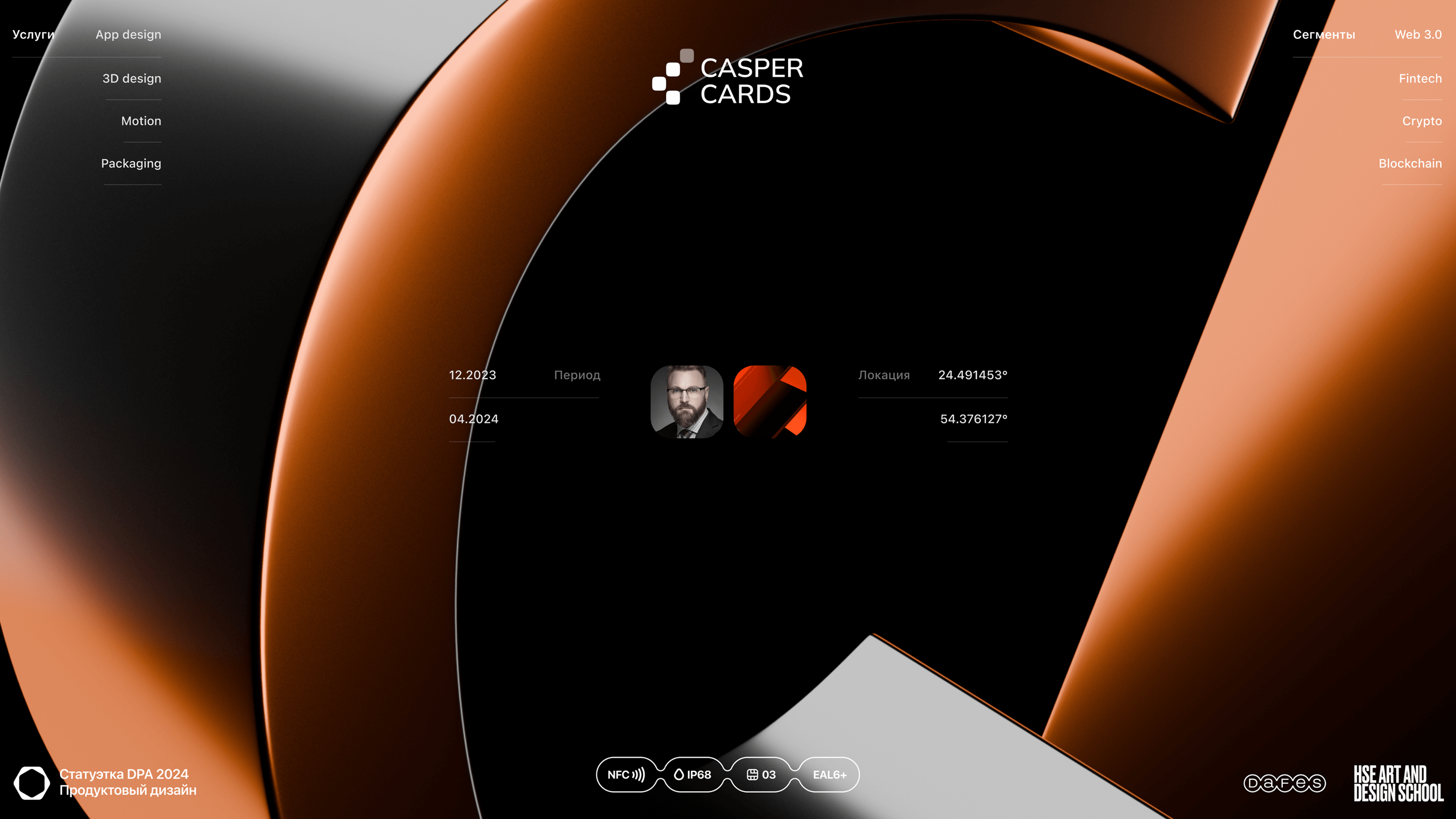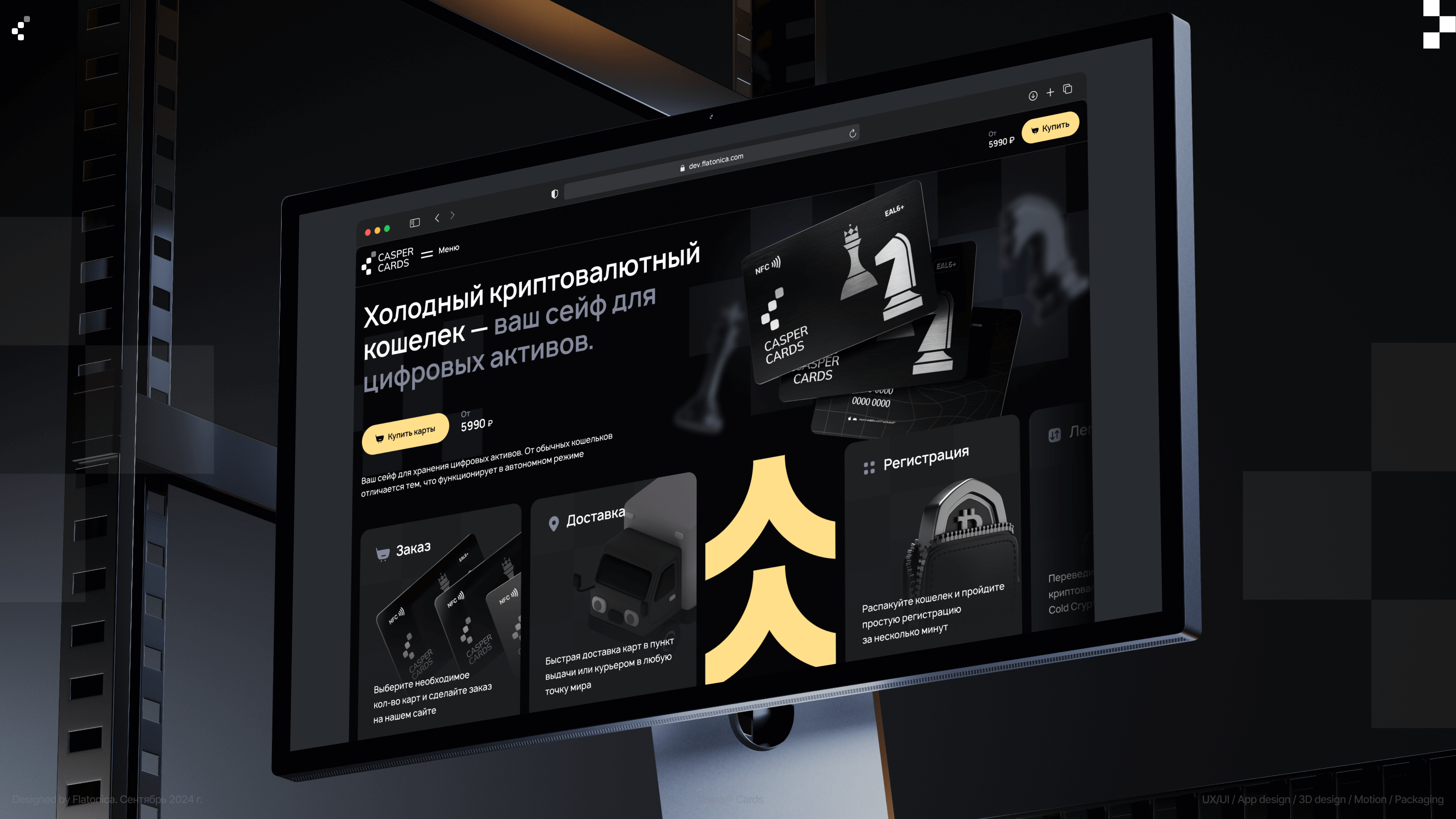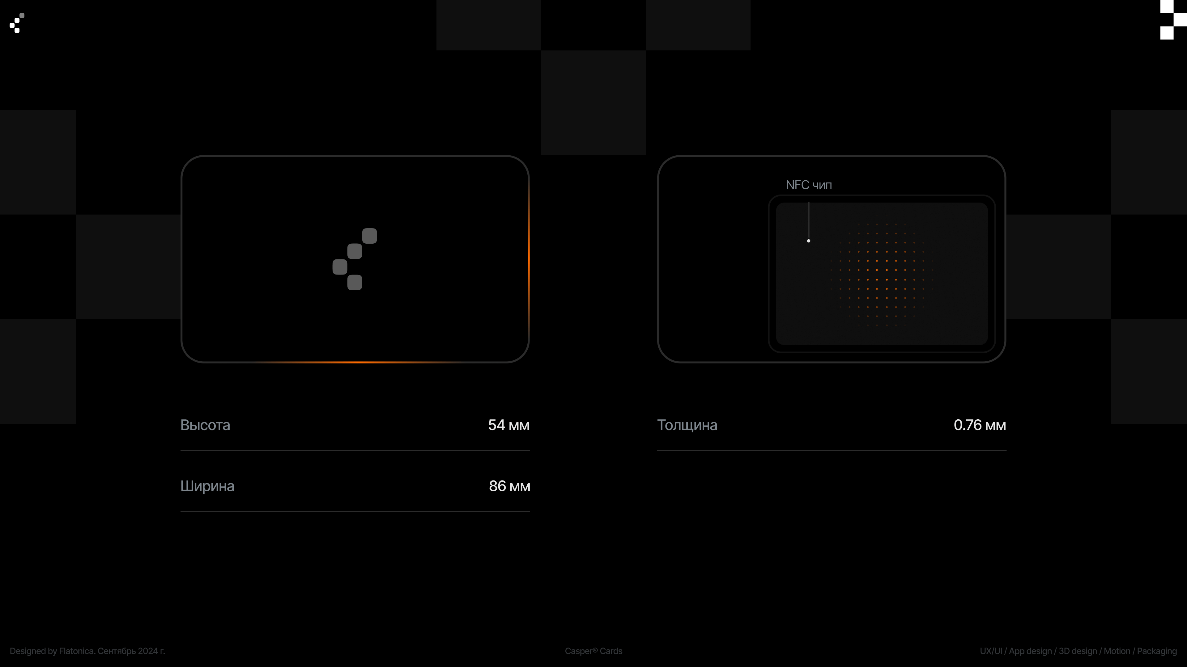 Каспер — имя персидского происхождения которое означает “хранитель сокровищ”. Суть продукта: это физическая карта для управления активами. В стиле бренда использованы квадраты как аналогия блокчейна, а также шахматная атрибутика симвозилирующая интеллект и деловую среду.