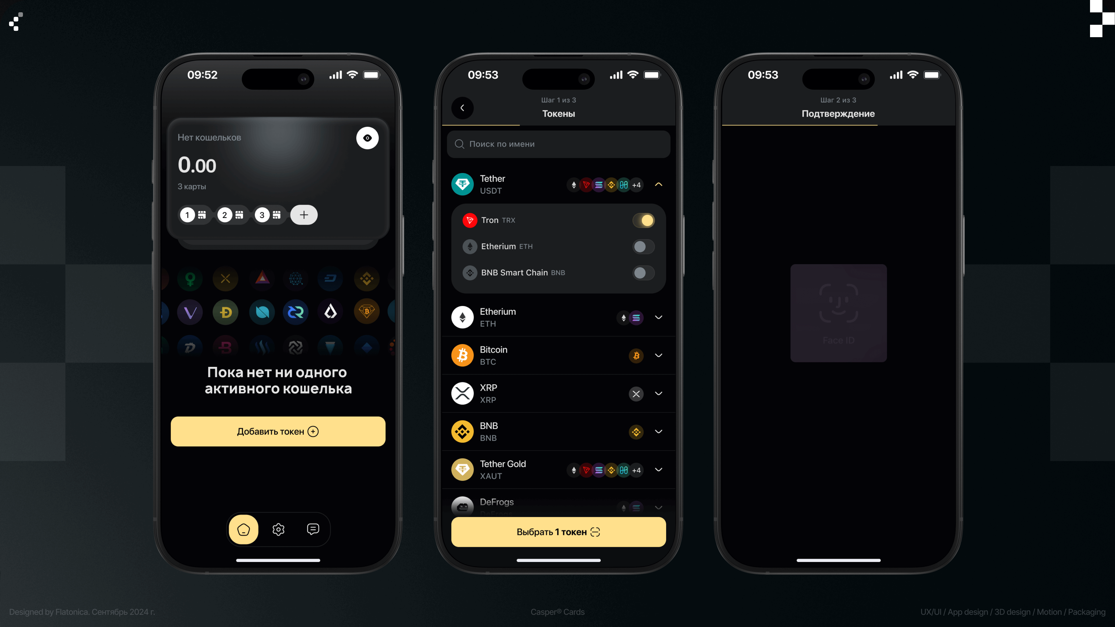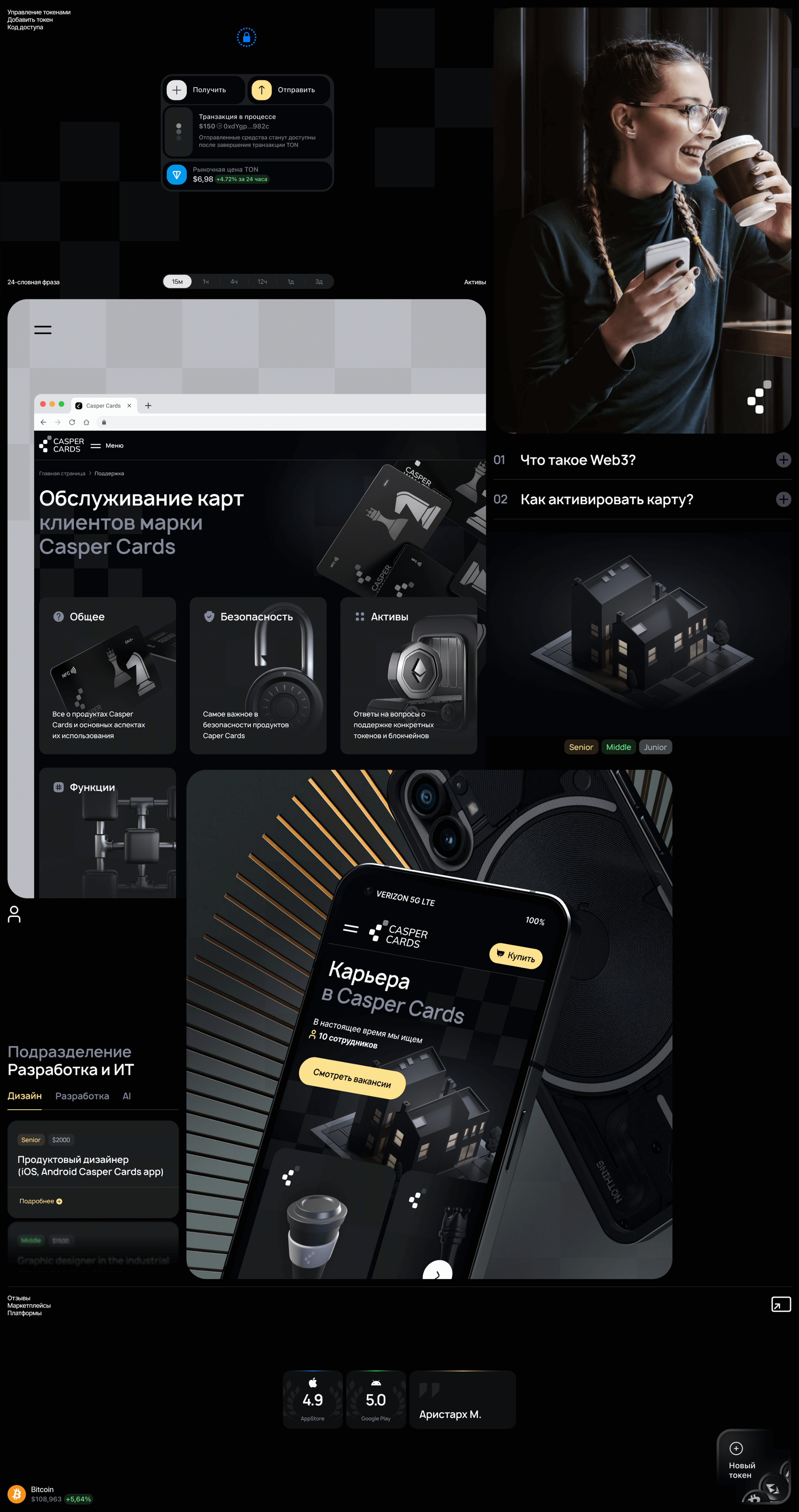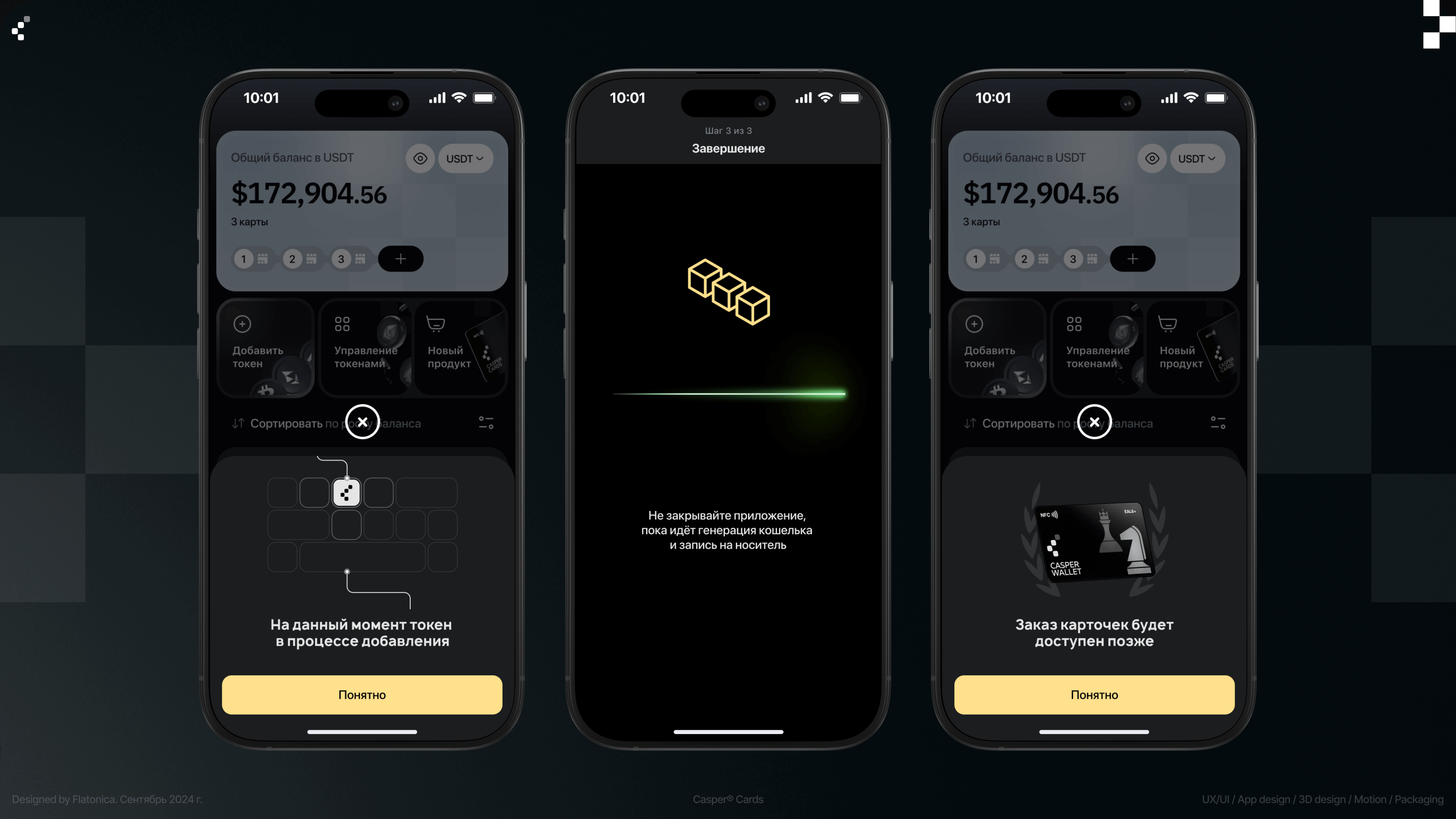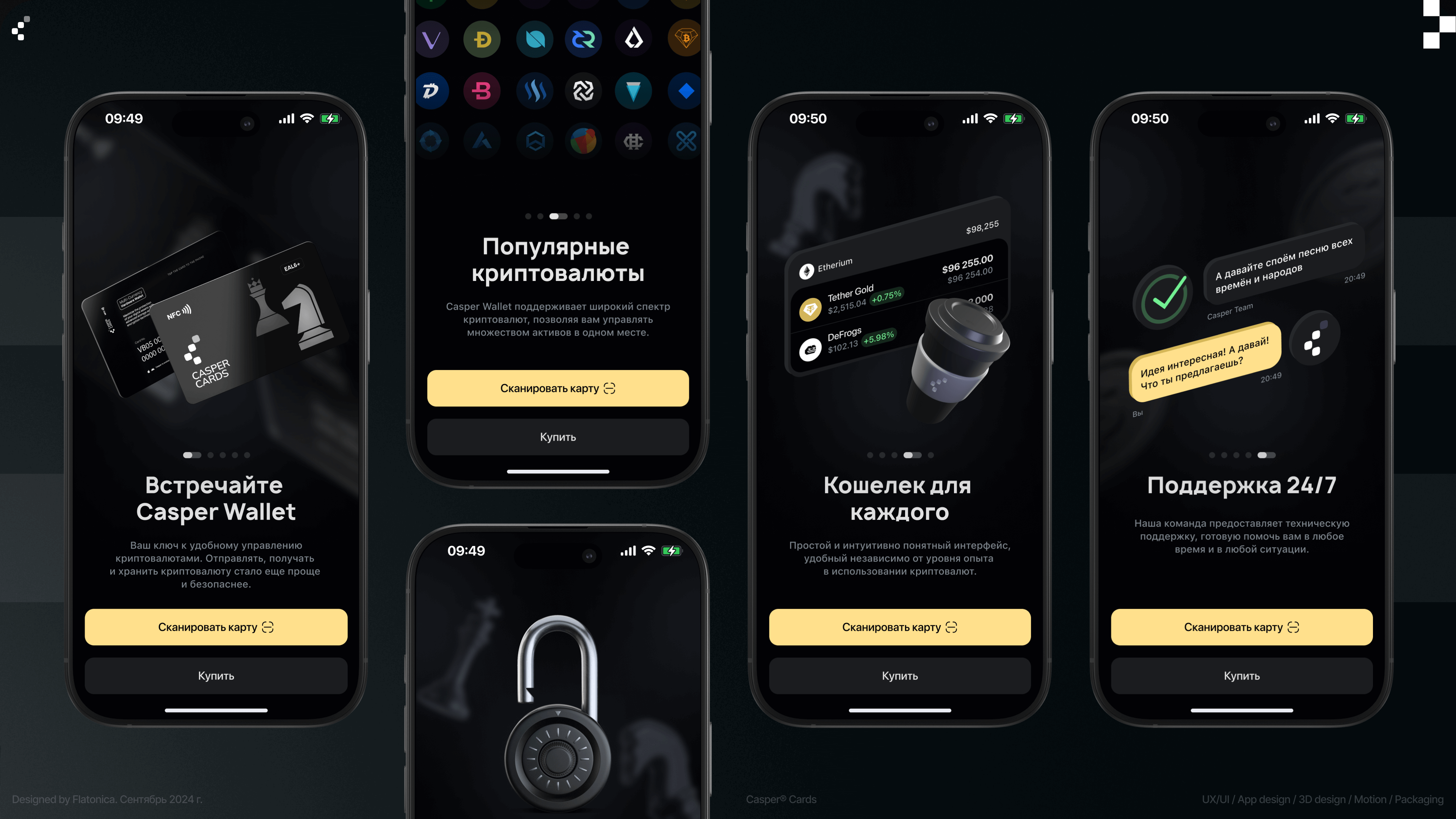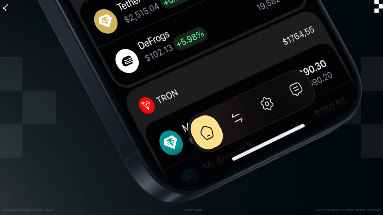 Каспер — имя персидского происхождения которое означает “хранитель сокровищ”. Суть продукта: это физическая карта для управления активами. В стиле бренда использованы квадраты как аналогия блокчейна, а также шахматная атрибутика симвозилирующая интеллект и деловую среду.