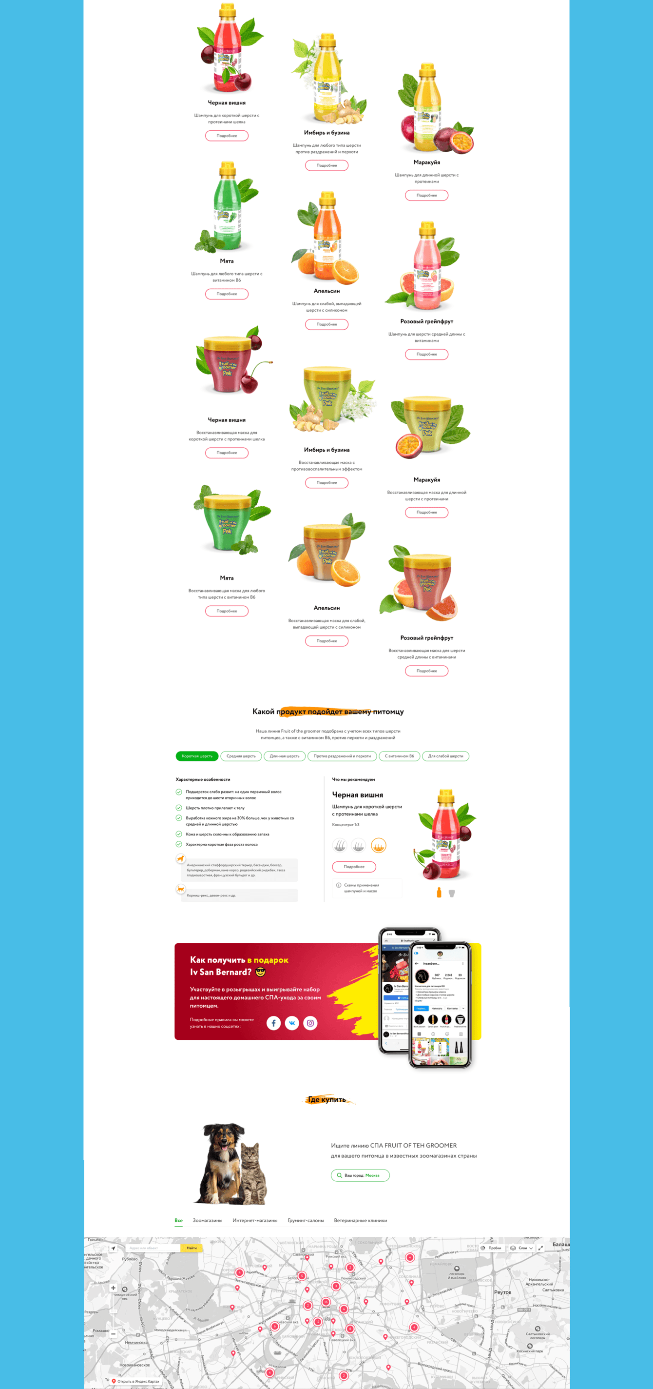 Разработать сайт для бренда «Fruit of the Groomer», специализирующегося на продукции для ухода за домашними животными. Сайт должен был представить продукцию бренда, её преимущества и обеспечить удобство взаимодействия для потенциальных клиентов.