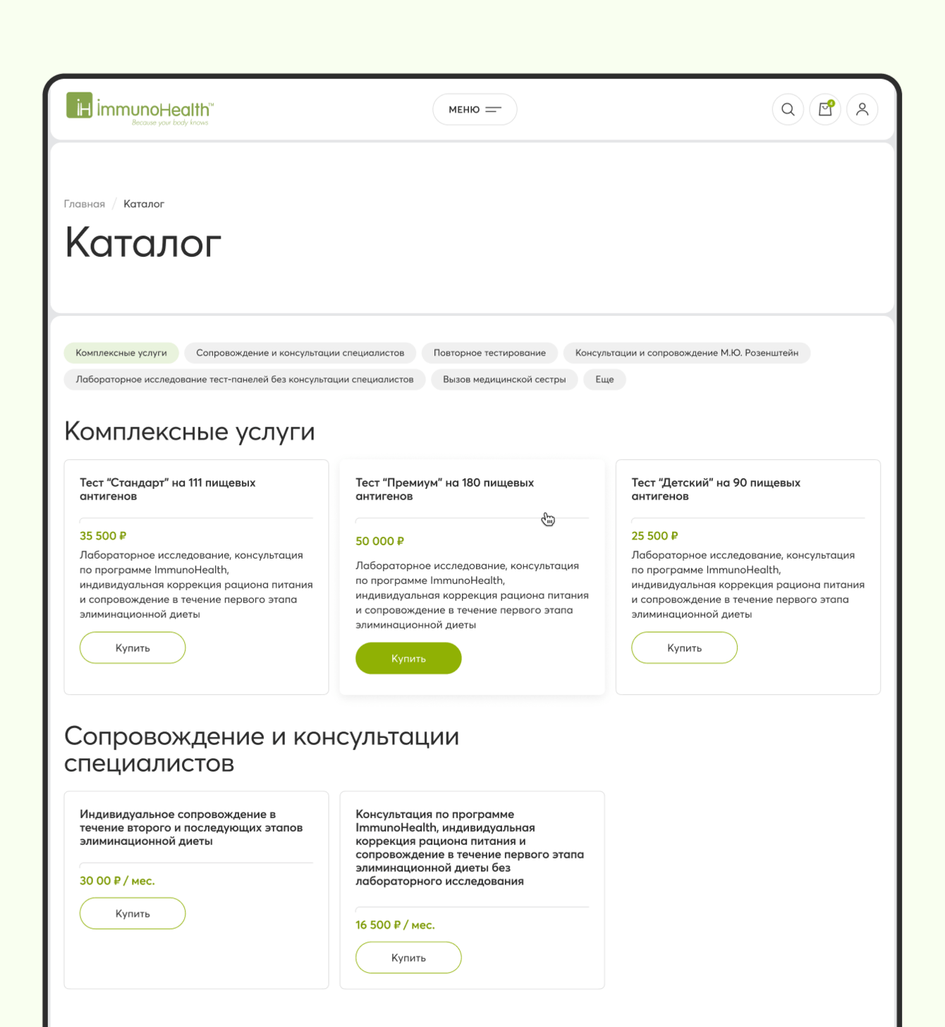 Мы разработали приятный дизайн, написали понятный текст про иммунодиетологические тесты, добавили на сайт карточки врачей и продумали каталог — с его помощью пользователи будут выбирать подходящие тесты и анализы и отправлять их в корзину.