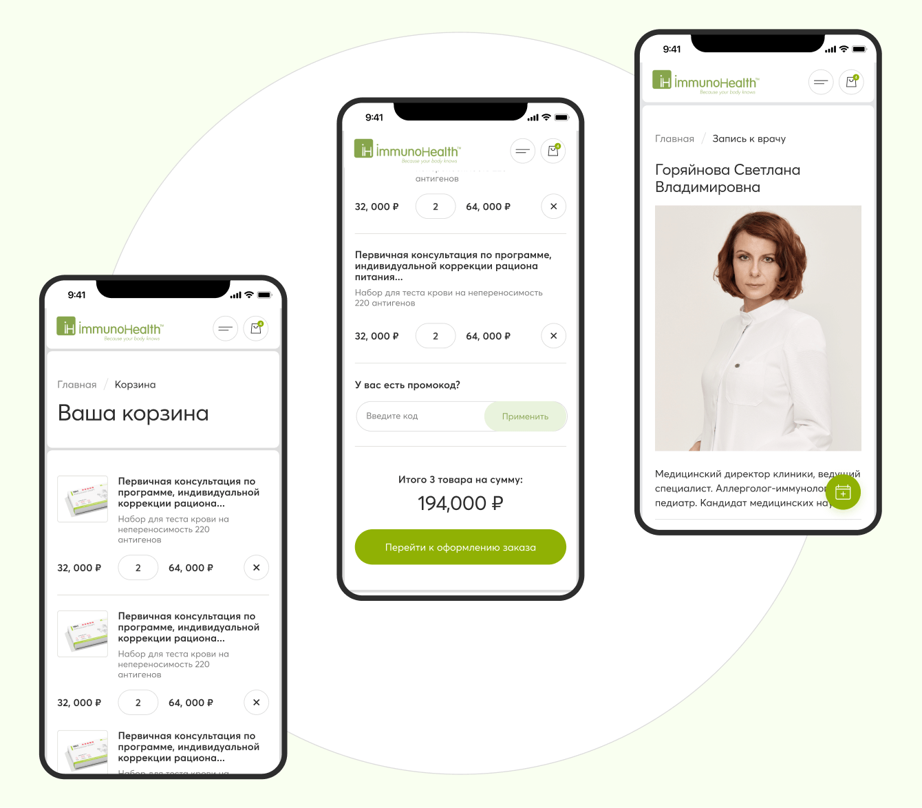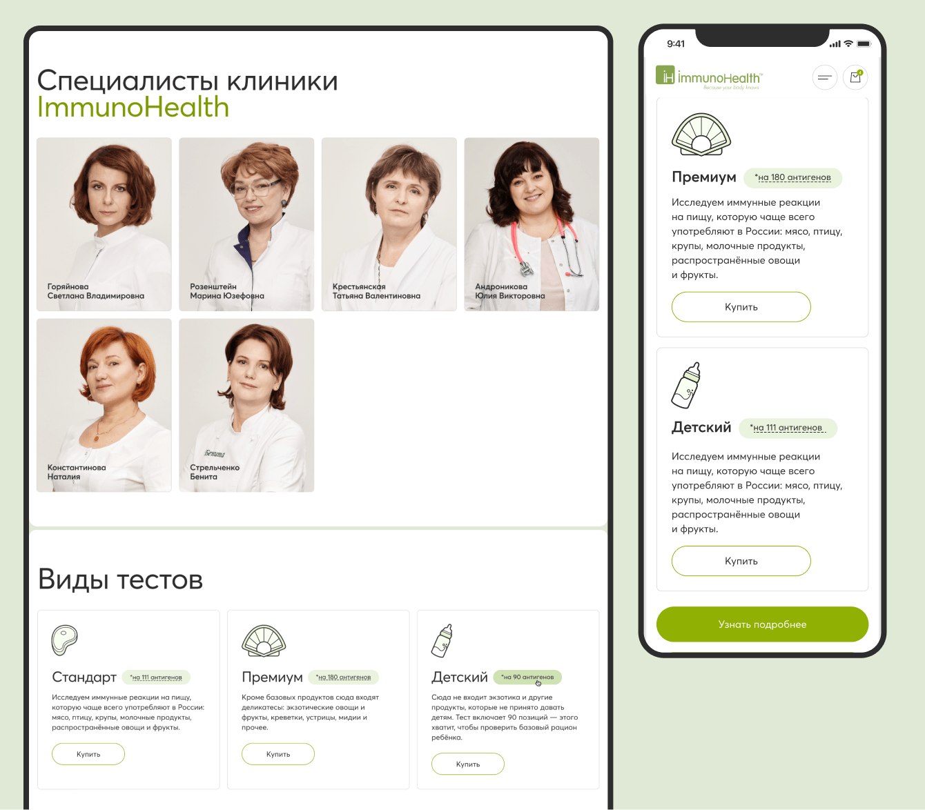 Мы разработали приятный дизайн, написали понятный текст про иммунодиетологические тесты, добавили на сайт карточки врачей и продумали каталог — с его помощью пользователи будут выбирать подходящие тесты и анализы и отправлять их в корзину.