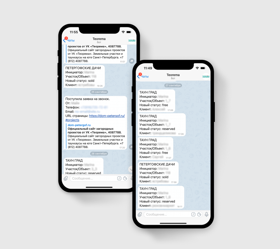 Одна из особенностей системы управления сайтом - возможность оперативно менять статусы участков посредством Telegram-бота менеджерами отдела продаж. Менеджеры отдела продаж с помощью чат-бота Telegram оперативно изменяют статусы участков или таунхаусов. Туда же дублируются заявки на бронирование с сайта.