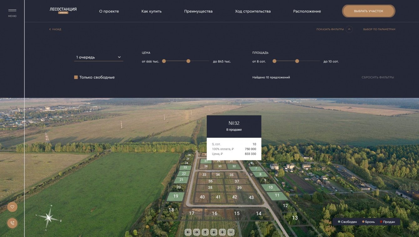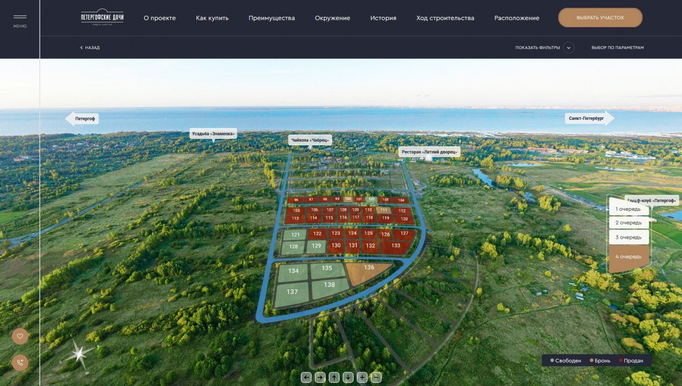 Одной из важных характеристик проекта Петергофские дачи является местоположение, поэтому выборщик участков сделан на основе интерактивных аэро-фотопанорам.