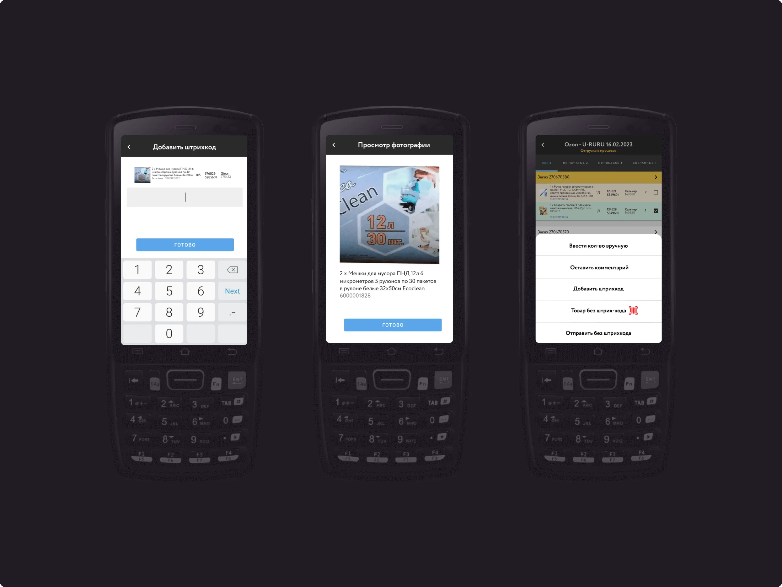 Для удобной сборки был реализованы интерфейсы обработки таких случаев как товарная позиция, от поставщика, пришедшая без штрих-кода, позиция с большим кол-вом товара, дефектная продукция и тд.