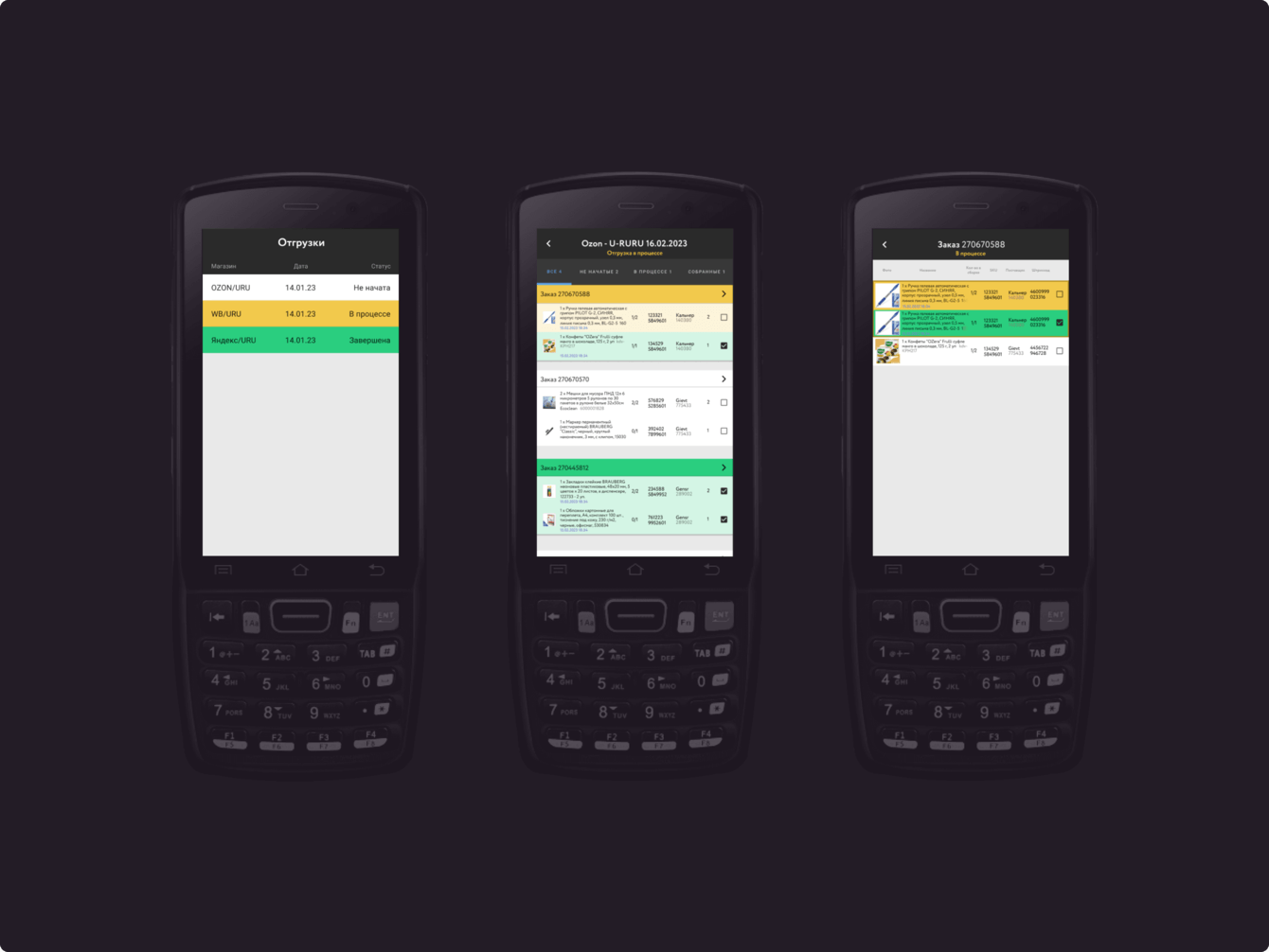 Информационная архитектура и UIKit были сформированы с учетом условий работы с ТСД, а именно яркая цветовая индикация и размер элементов.