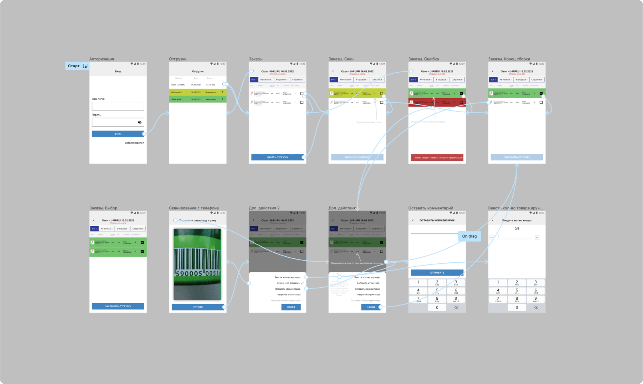 Нашей команде был показан процесс сборки заказа на складе и работу в ERP, продемонстрированы проблемные ситуации при сборке и все нюансы которые было необходимо учесть в приложении.В течение 2-х дней был разработан и показан кликабельный прототип. После чего мы вместе с командой заказчика его доработали и согласовали для этапа дизайна.