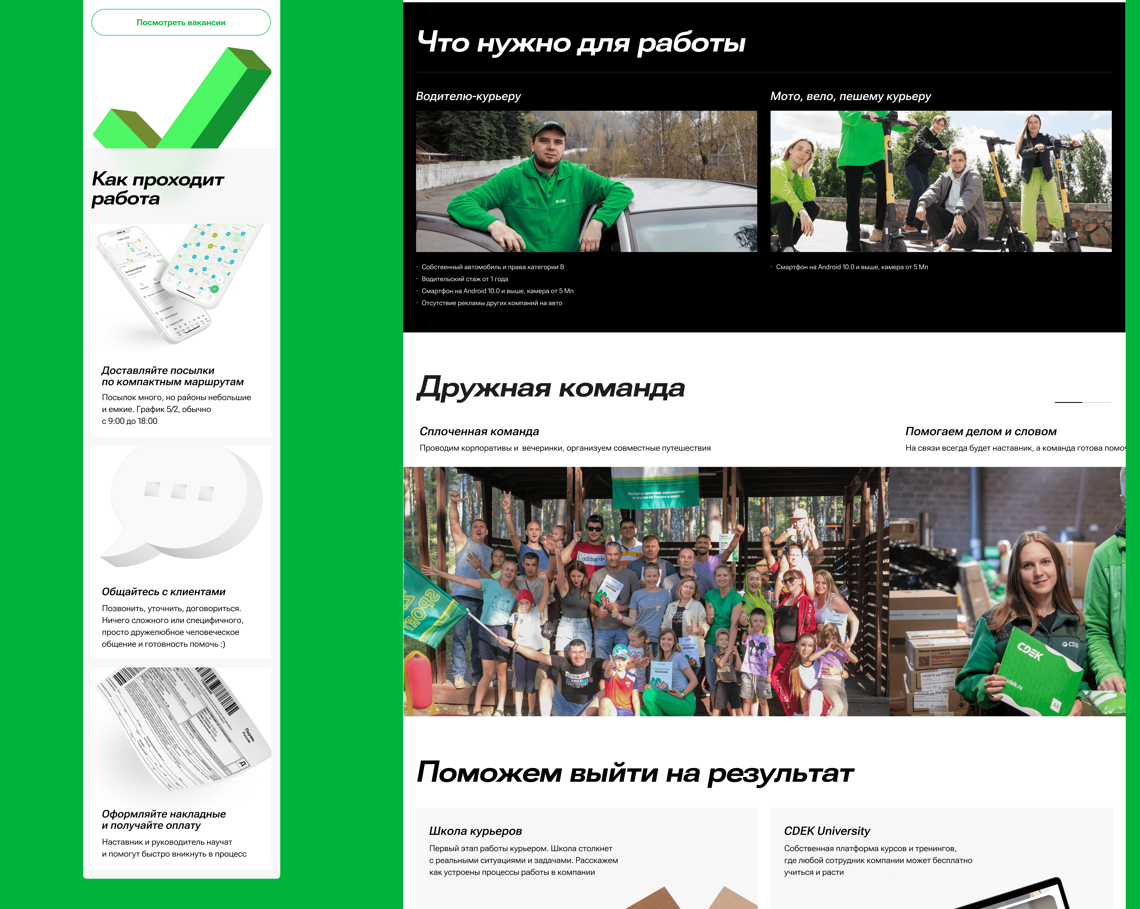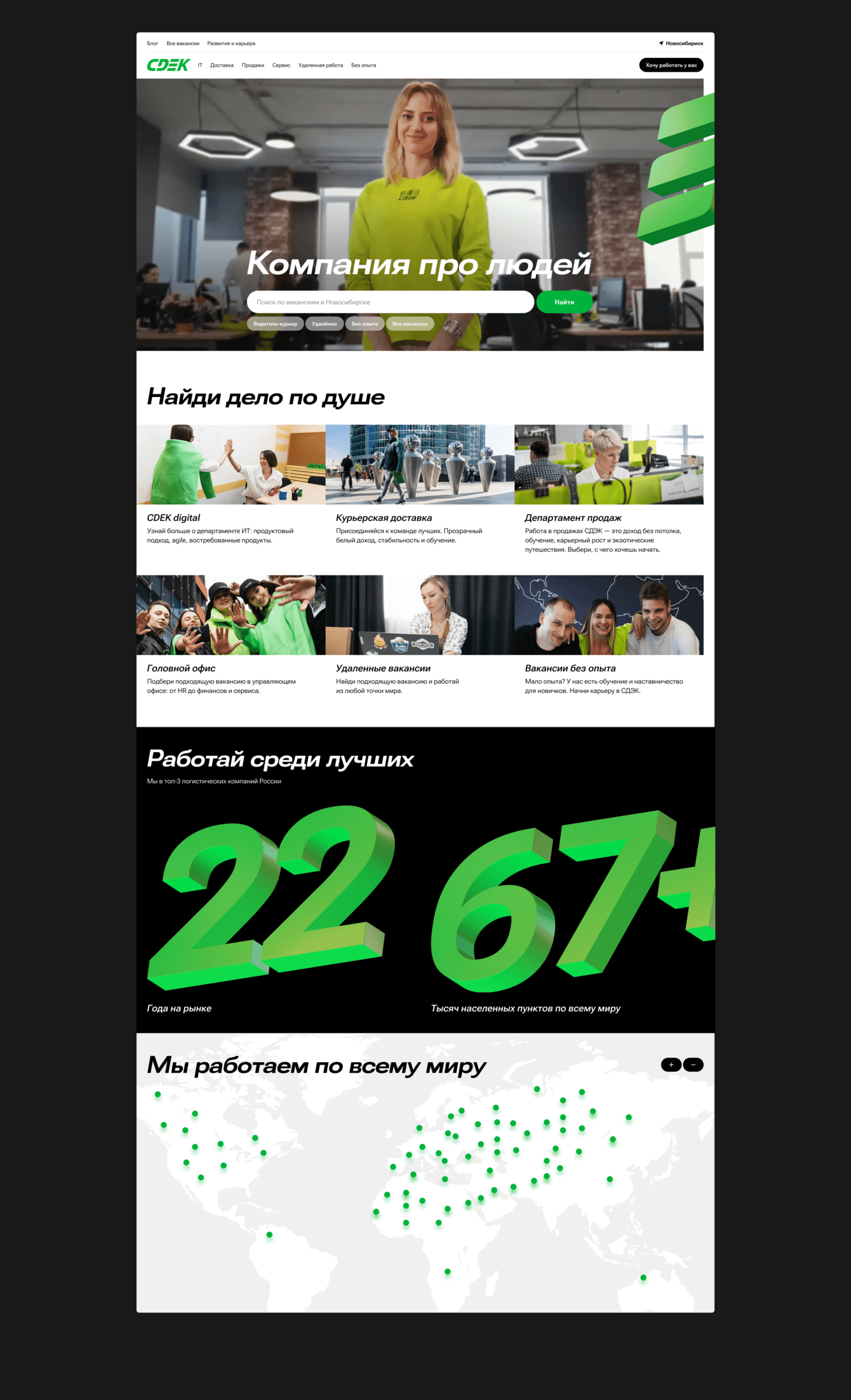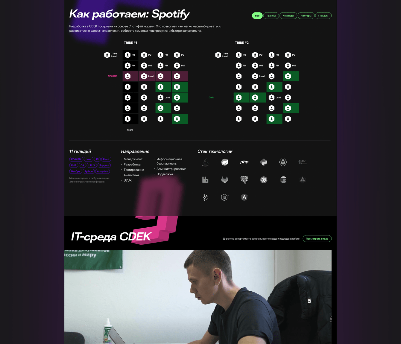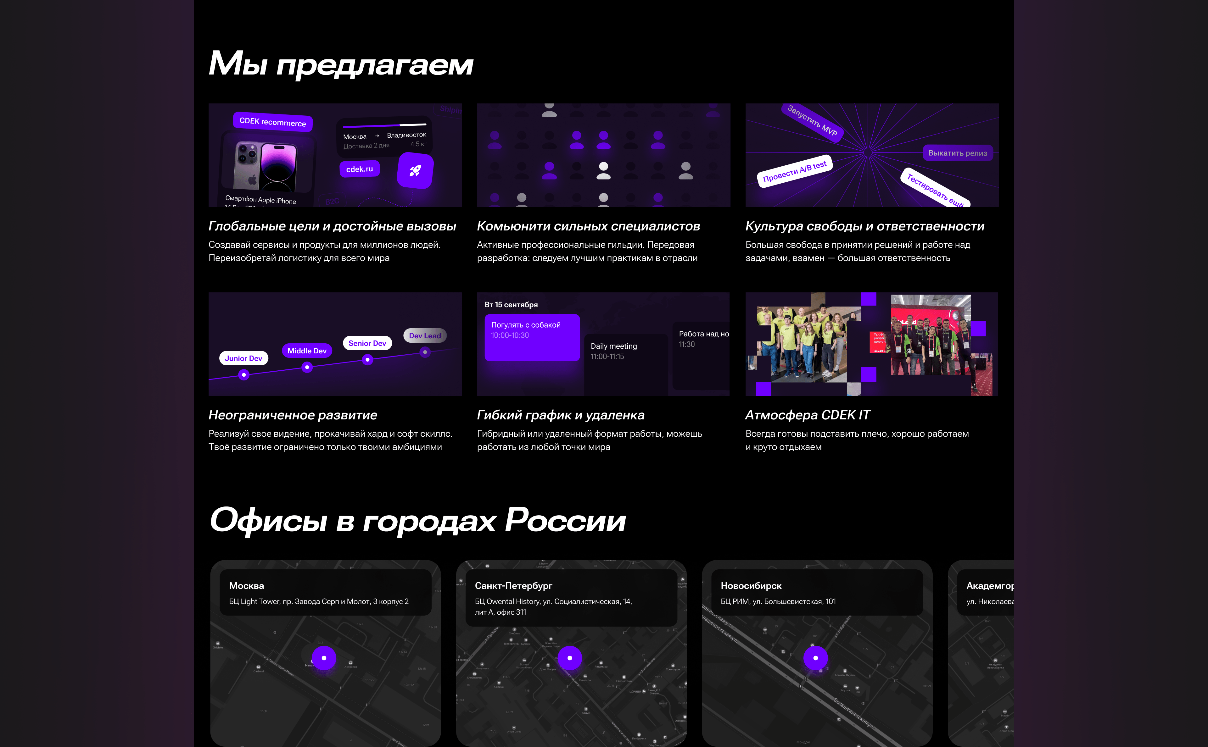 Для IT-направления был сделан большая целевая страница с рассказом о продуктах, структуре команды, преимуществах. Дизайн выполнен в чёрных цветах, чтобы выделить направление среди остальных и подчеркнуть, насколько CDEK ценит разработчиков, ведь разработчики любят чёрный :)